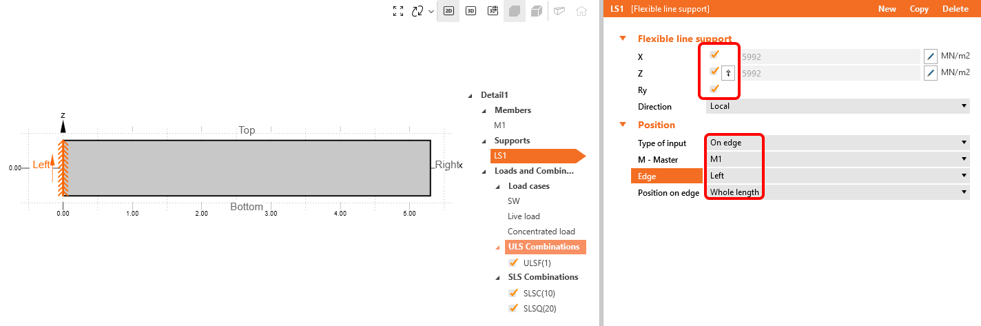 The support is related to the edge Left. All plane degrees of freedom X, Z, Ry are restrained. The support is typically configured as inactive in tension to account for the nonlinearity of the support in tension. For this project, please disable this setting.
