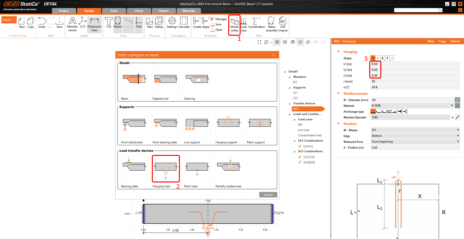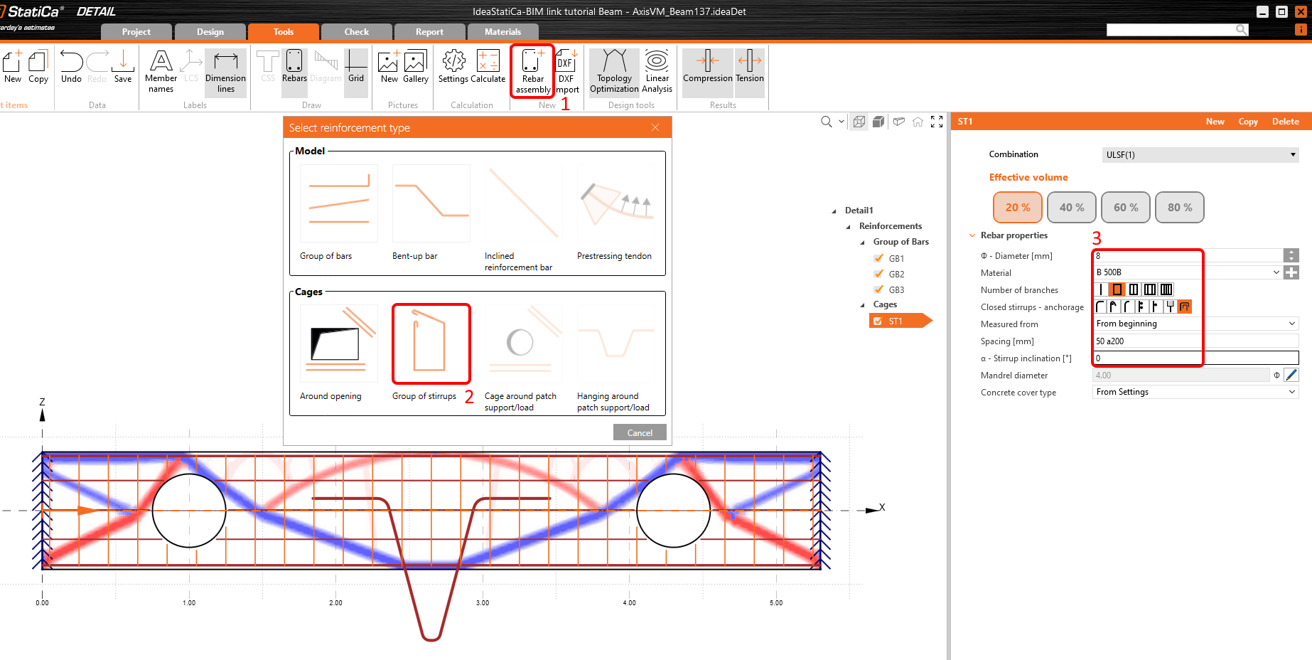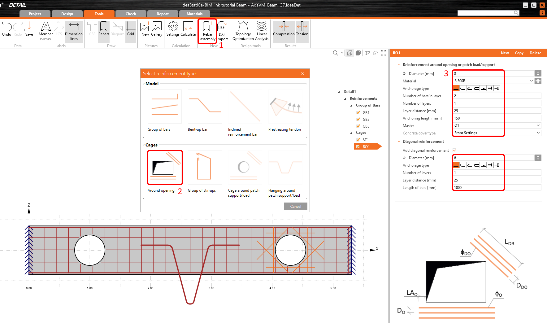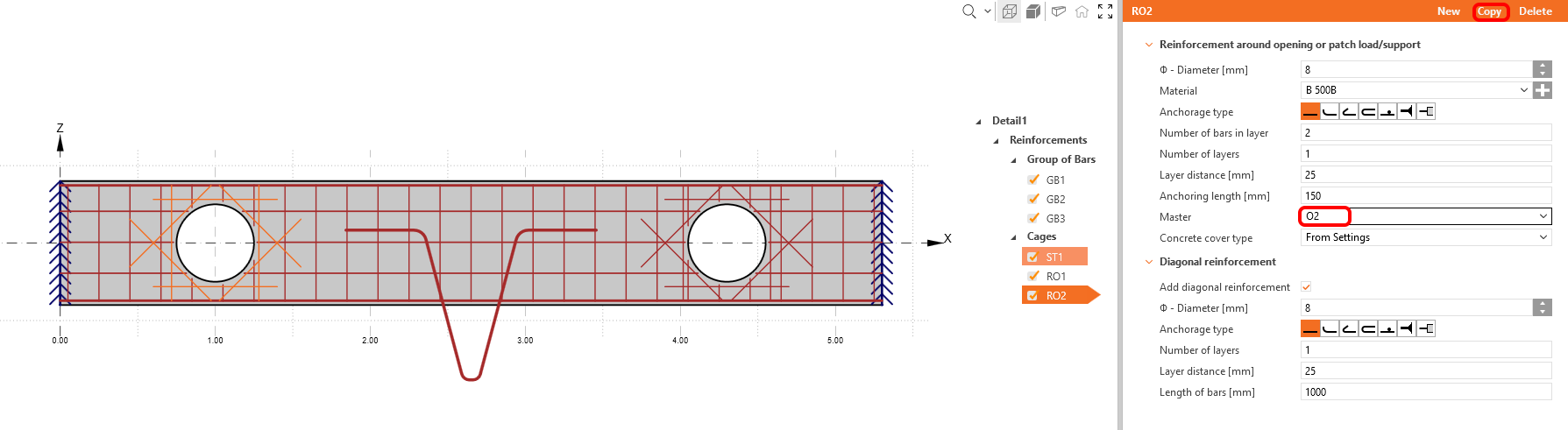 Move to the Reinforcement tab in the navigator. Due to the fact that the beam includes openings and hanging, export all the beam to the Detail app. Use the Detail button in the ribbon for the desired export