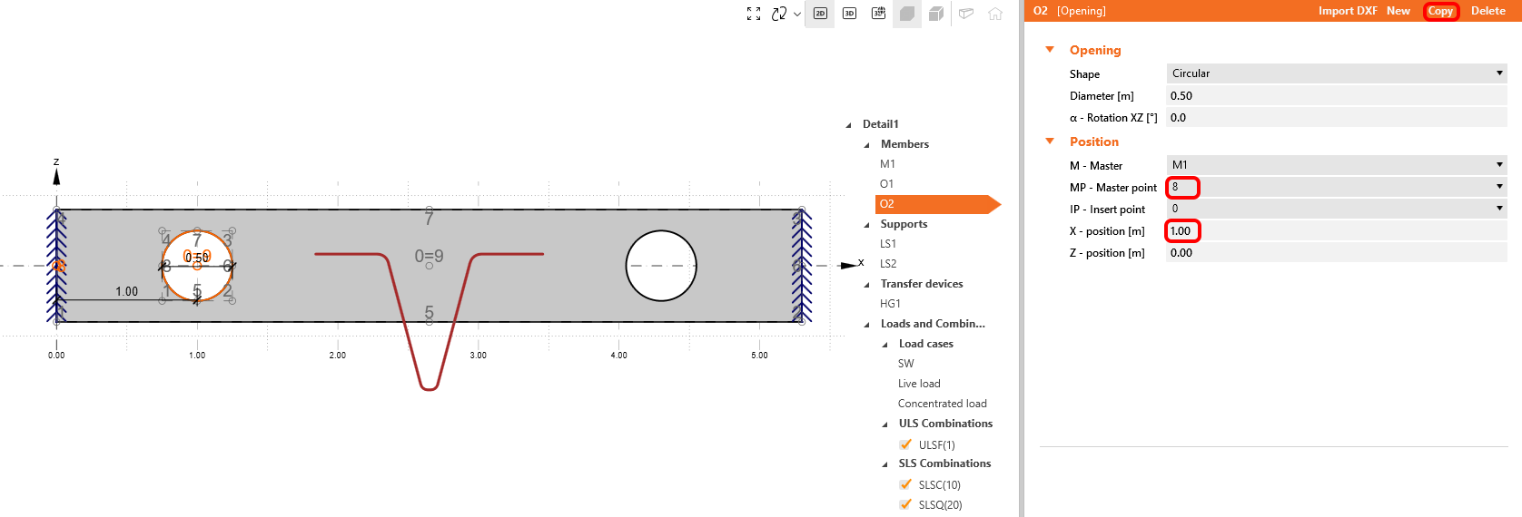 In the same way as for hanging create an opening and set up the parameters according to the picture. Change the shape on Circular with Diameter 0.5 m. Masterpoint set on position 6 and change the X-position about -1 m.