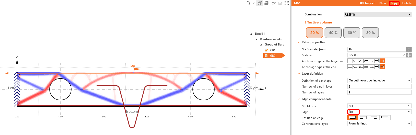 Select the group of bar GB1 from the template. Set the 1 layer of reinforcement, Diameter 16 mm and 2 bars in the existing layer. Please set the anchorage type to continuous bar. This is crucial for accurately simulating the boundary conditions and ensuring correct analysis of the all structure.