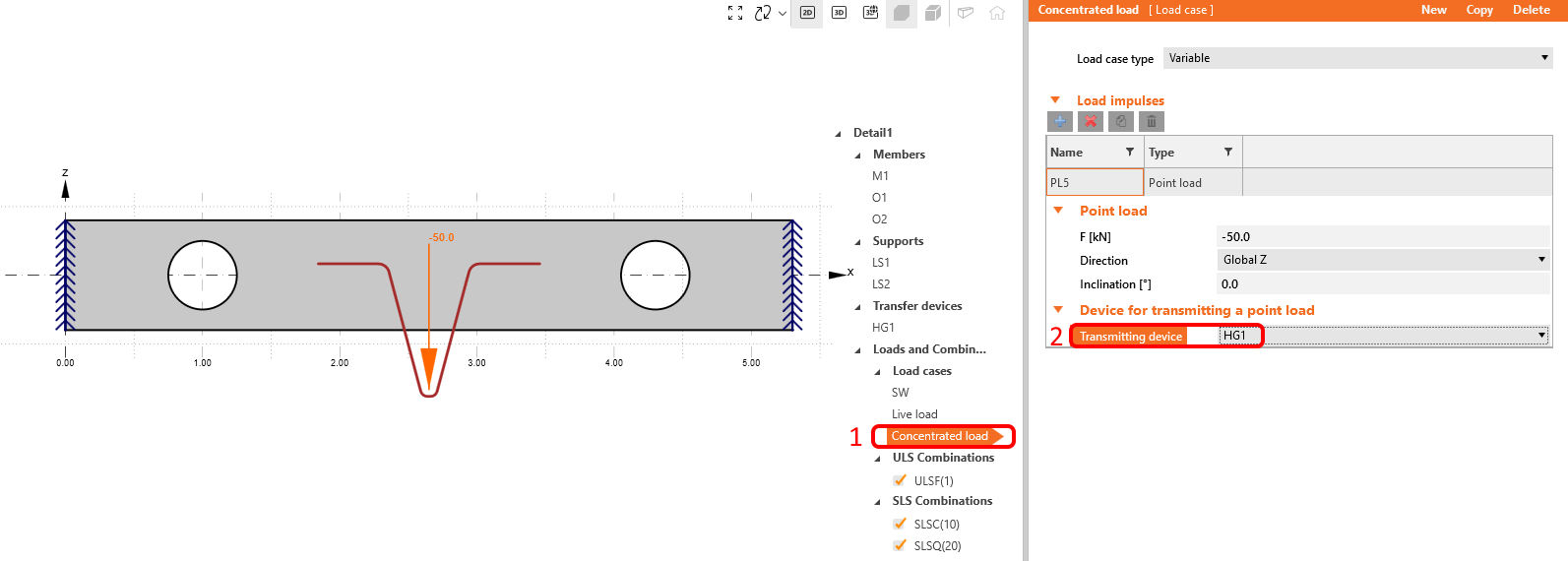 Assign the concentrated force to HG1. Since the force has been related to hanging the concrete is loaded through this device. You do not have to bother with creating the combinations. The prescription of the combinations is taken over from the IDEA StatiCa Beam app.