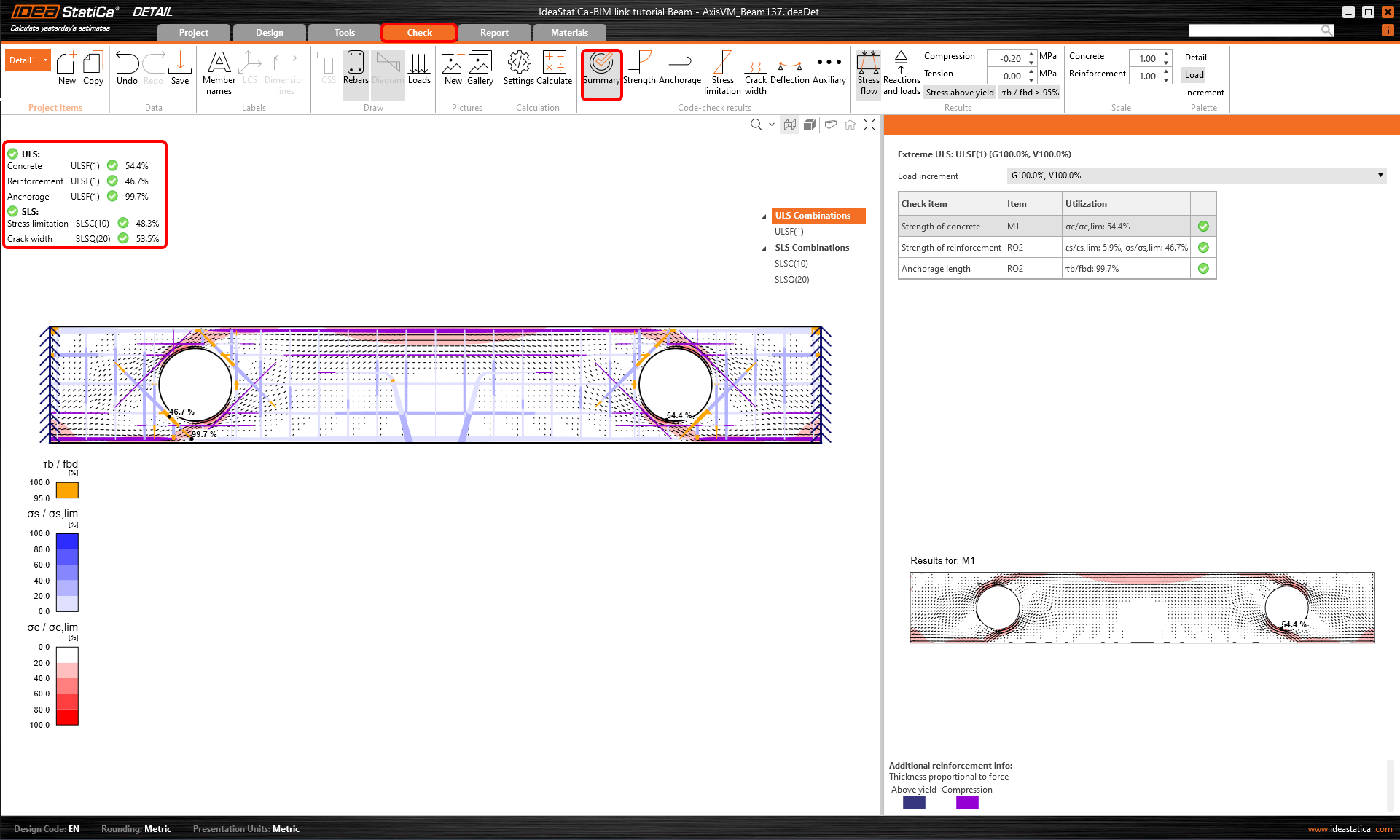 Run the nonlinear analysis. You receive a summary overview of the results with critical checks for ULS and SLS. In the 3D scene are displayed areas with maximal utilization of each entity.