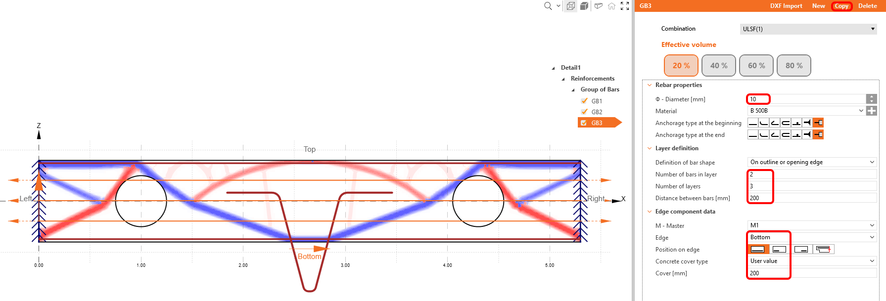 Copy GB2, distribute the reinforcement along with the height of the beam and change Diameter in 10 mm. Please increase the number of layers to 3 and set the distance between layers to 200 mm. Additionally, change the edge to the bottom and adjust the concrete cover to 200 mm.