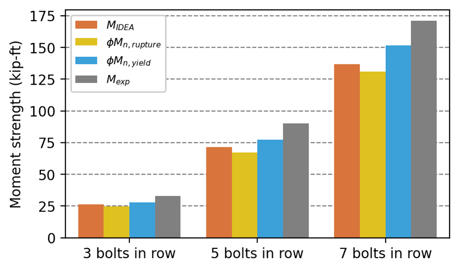 The limit state of tensile rupture was investigated in this study through comparison to hundreds of experimental results. The results show that IDEA StatiCa is generally conservative, especially at the nominal strength level, but there are some cases where the available strength from IDEA StatiCa is greater than that calculated according to the AISC Specification. Using measured material and geometric properties without resistance factors applied, the strength from IDEA StatiCa was less than or equal to the experimentally observed strength for all but 12 specimens out of 529 (9 of which were fabricated with high-strength steel, Fy = 122.8 ksi) and less than or equal to the expected tensile rupture strength computed using design equations for all but 30 specimens out of 529. Using nominal material and geometric properties with resistance factors applied, the strength from IDEA StatiCa was found to be greater than the strength computed according to the AISC Specification for some connections without physical counterparts, especially plate tension members with relatively short welds, and rectangular HSS tension members. Given that the experimental data for these cases is limited, work is ongoing to determine if the differences are the result of unconservatism in IDEA StatiCa or conservatism in the AISC Specification equations.
