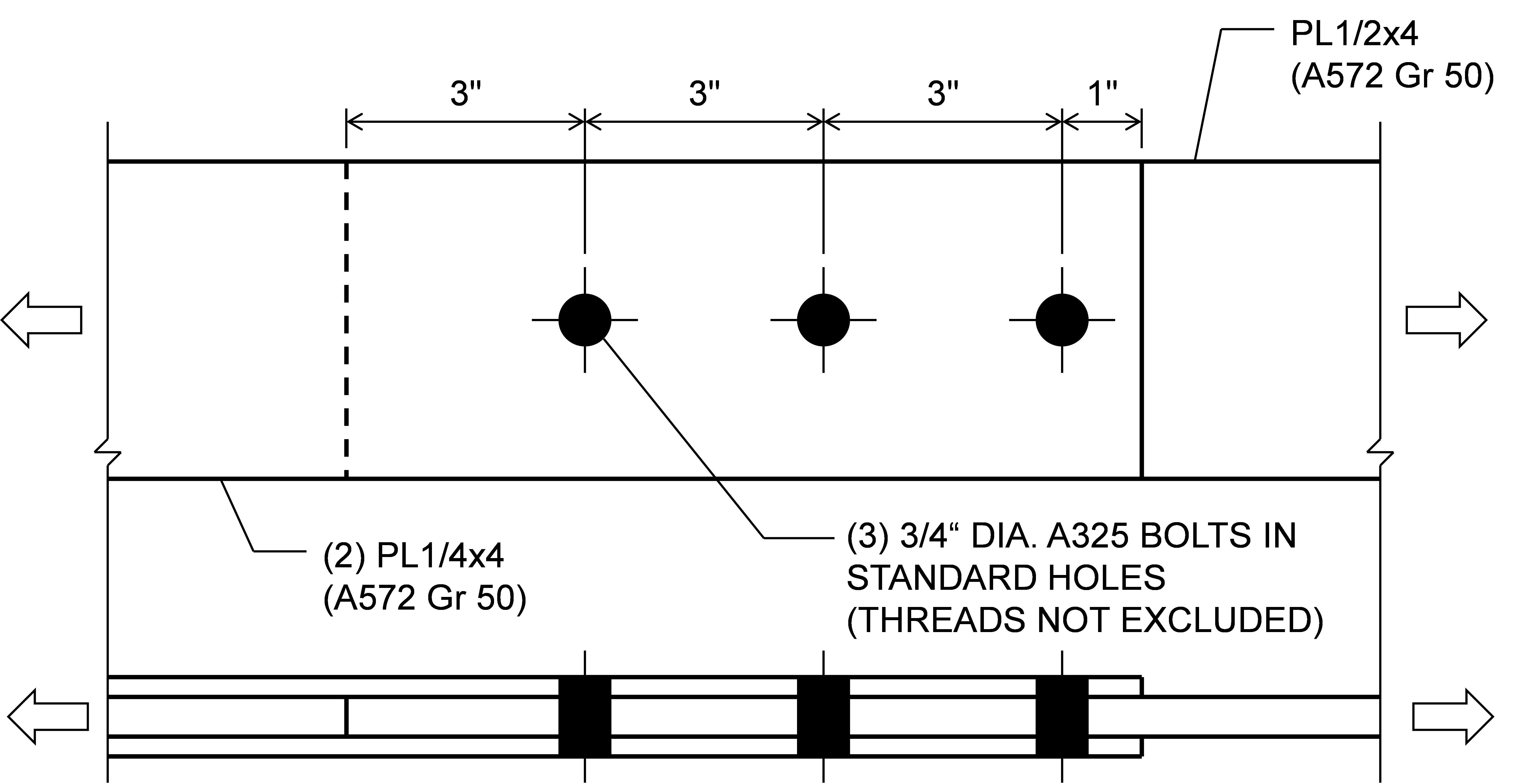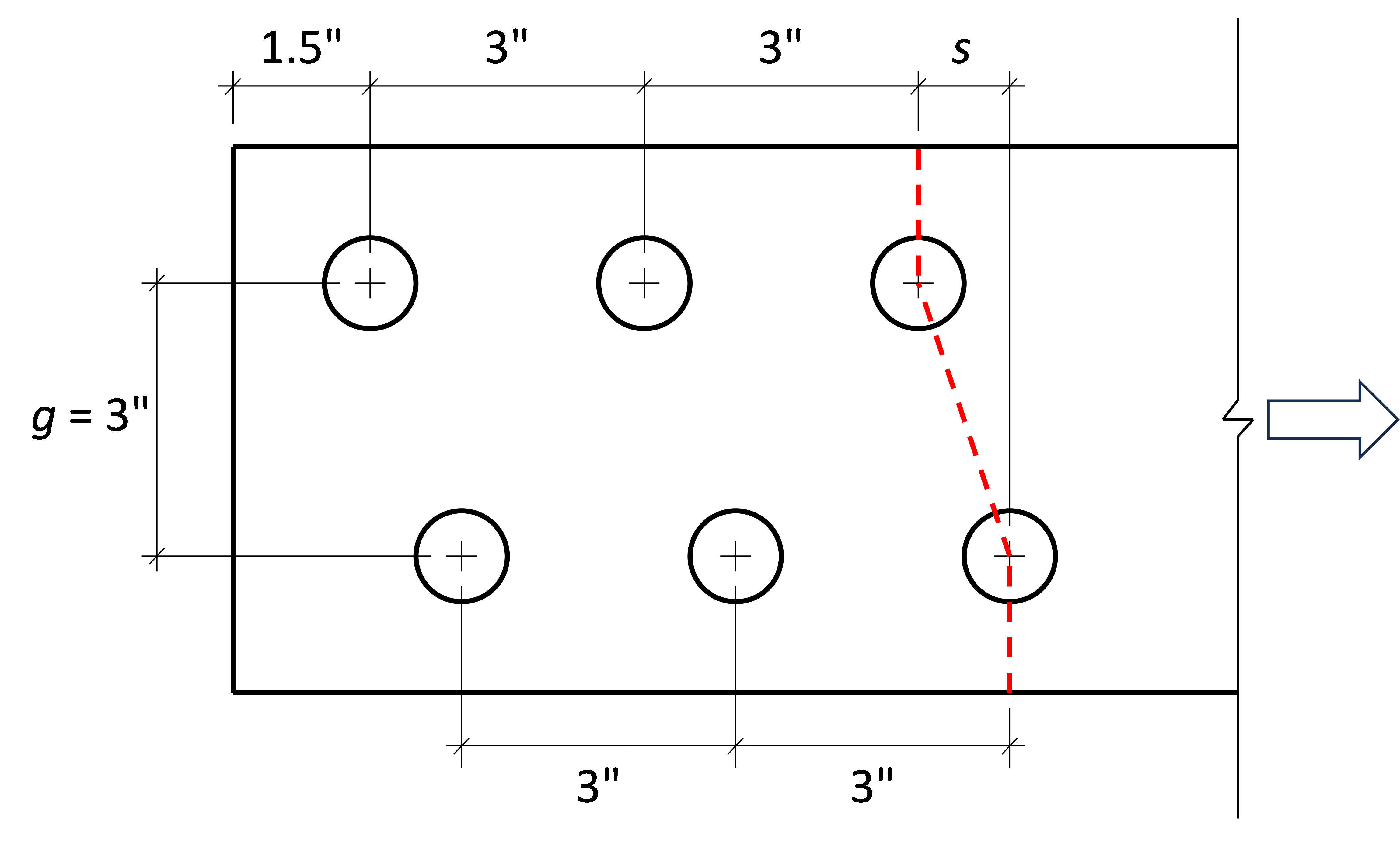 The effect of staggering bolt lines can be observed in a simple splice connection. A test plate is bolted between two reaction plates and loaded in tension. The thickness of the test plate is 1/2 in. and the thickness of each reaction plate is 3/8 in. All plates are 6 in. wide and conform to ASTM A572 Gr 50 (Fy = 50 ksi, Fu = 65 ksi). The connection has (6) 7/8 in. diameter A325 bolts in two staggered lines. The spacing between bolts in a line is 3 in., the gage, g, is 3 in., and the edge distance is 1.5 in. The amount of stagger between the two lines of bolts is measured by the dimension s.