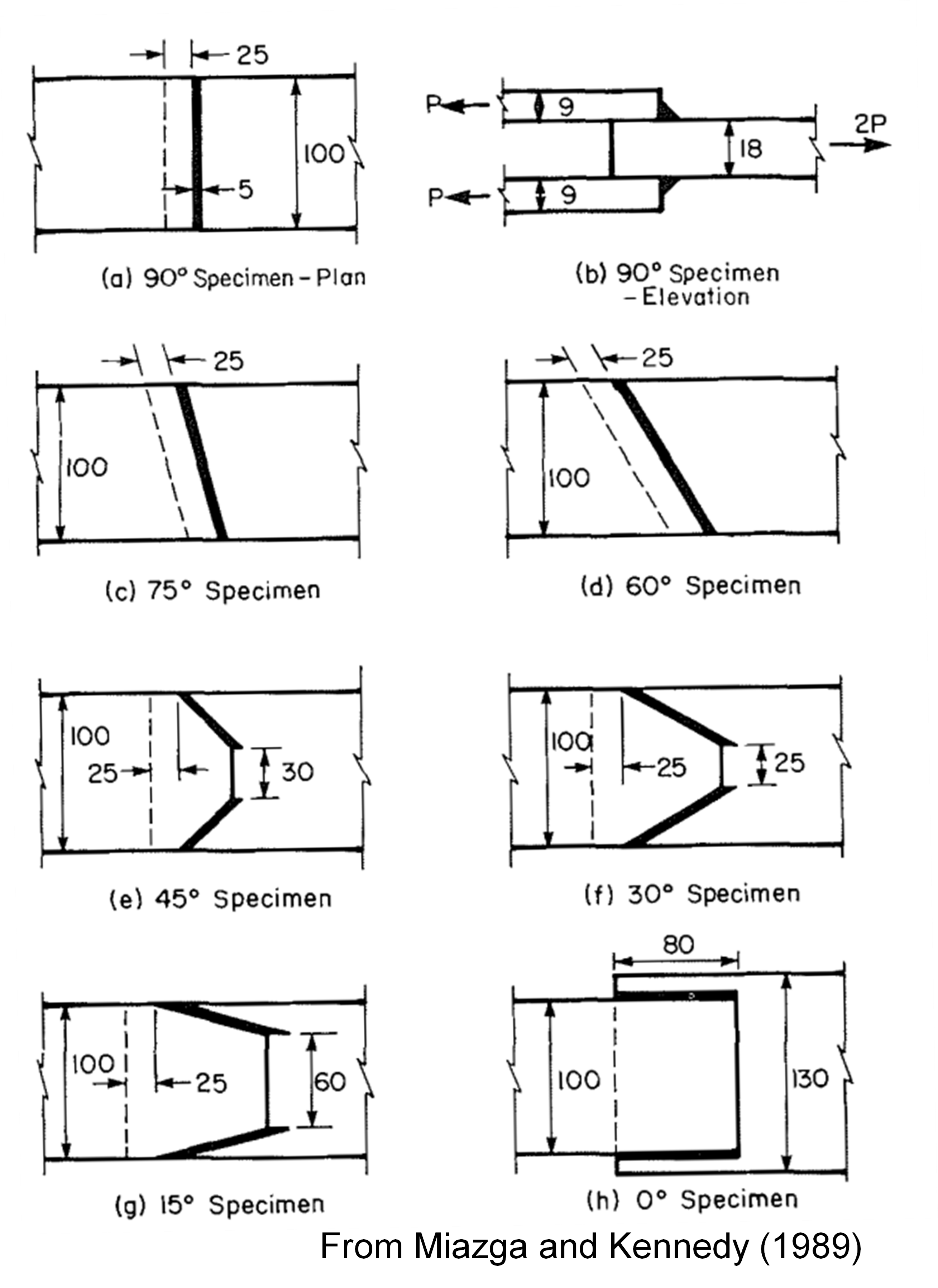 To illustrate the effect of the directional strength increase, consider the welded specimens tested experimentally by Miazga and Kennedy (1989). The specimens had loading angles of 0, 15, 30, 45, 60, 75, and 90 degrees as shown in the figure below where the units are millimeters. The plates were fabricated with CAN3-G40.21-M8 grade 300W steel. The exterior plates had a measured yield strength of 52.8 ksi. The interior plates had a measured yield strength of 50.2 ksi. E48014 electrodes with a nominal strength of FEXX = 70 ksi were used.