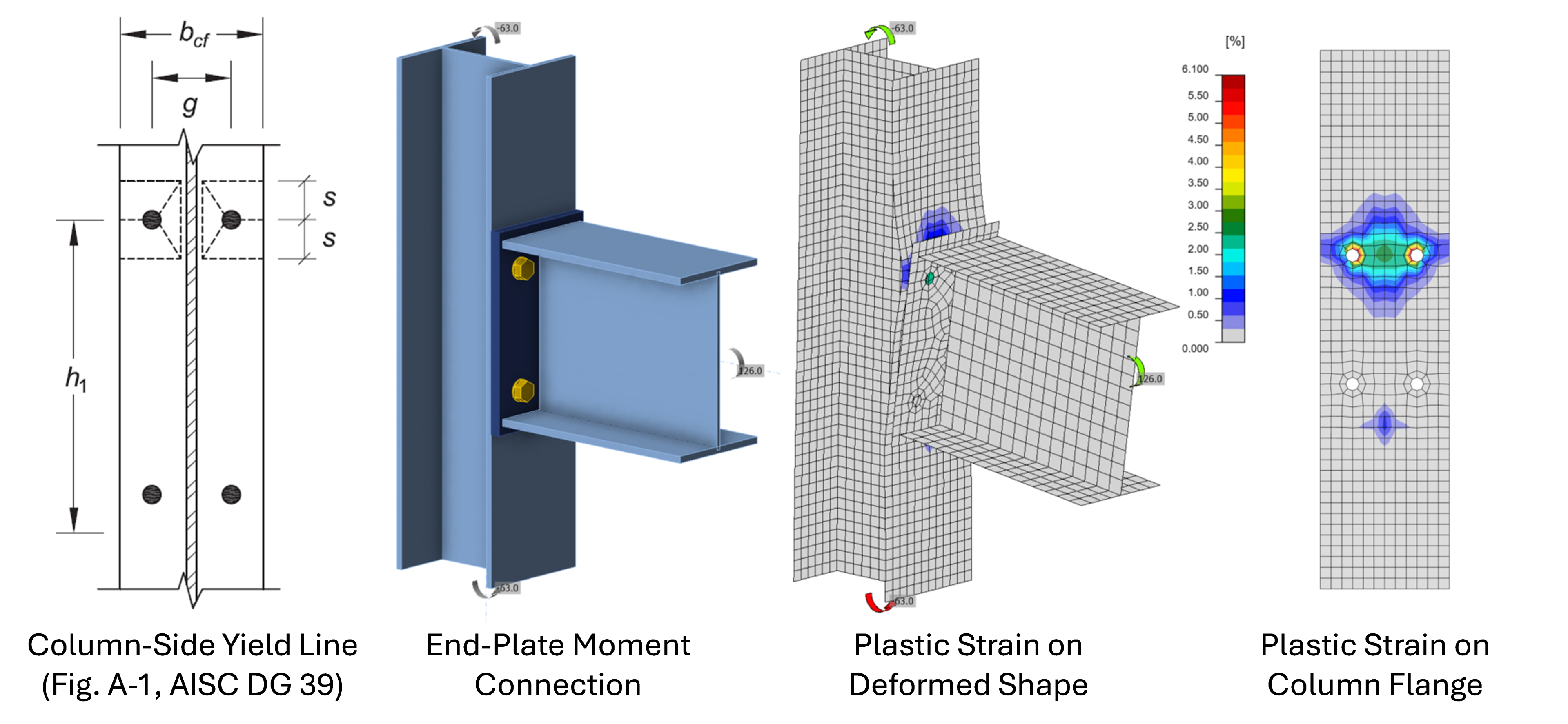 In IDEA StatiCa, panel-zone shear yielding is modeled explicitly with nonlinear shell elements and is limited by a plastic strain limit. The limit state of panel-zone shear yielding was explored for extended end plate moment connections in this article and for bolted flange plate moment connections in this article. Using the default plastic strain limit of 5%, the strength from IDEA StatiCa exceeds that from the AISC Specification for when the effect of inelastic panel-zone deformation on frame stability is not accounted for in the analysis. However, reducing the plastic strain limit to a small value (e.g., 0.1%) in IDEA StatiCa enforces essentially elastic behavior and results in strengths that are accurate in comparison to the AISC Specification equations for when the effect of inelastic panel-zone deformation on frame stability is not accounted for in the analysis.