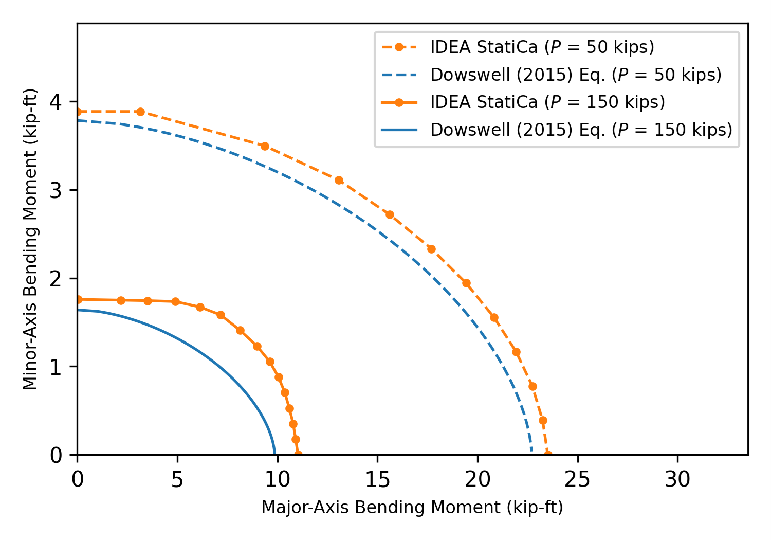 Results of the IDEA StatiCa analyses are shown in the figure below. Interaction diagrams based on the Dowswell (2015) equation are also shown in the figure. Available strengths used for the calculated interaction diagrams are Pc = ϕPn = 194.4 kips, Mcx = ϕMnx = 24.3 kip-ft, and Mcy = ϕMny = 4.05 kip-ft. Differences are seen between the IDEA StatiCa results and those from the interaction equation, including when only one action is applied. The causes of the differences under a single action are described in the entries on flexural yielding and tensile yielding. The differences between IDEA StatiCa and the approximate equation for combined actions are greater, but the IDEA StatiCa results show clear interaction effects.