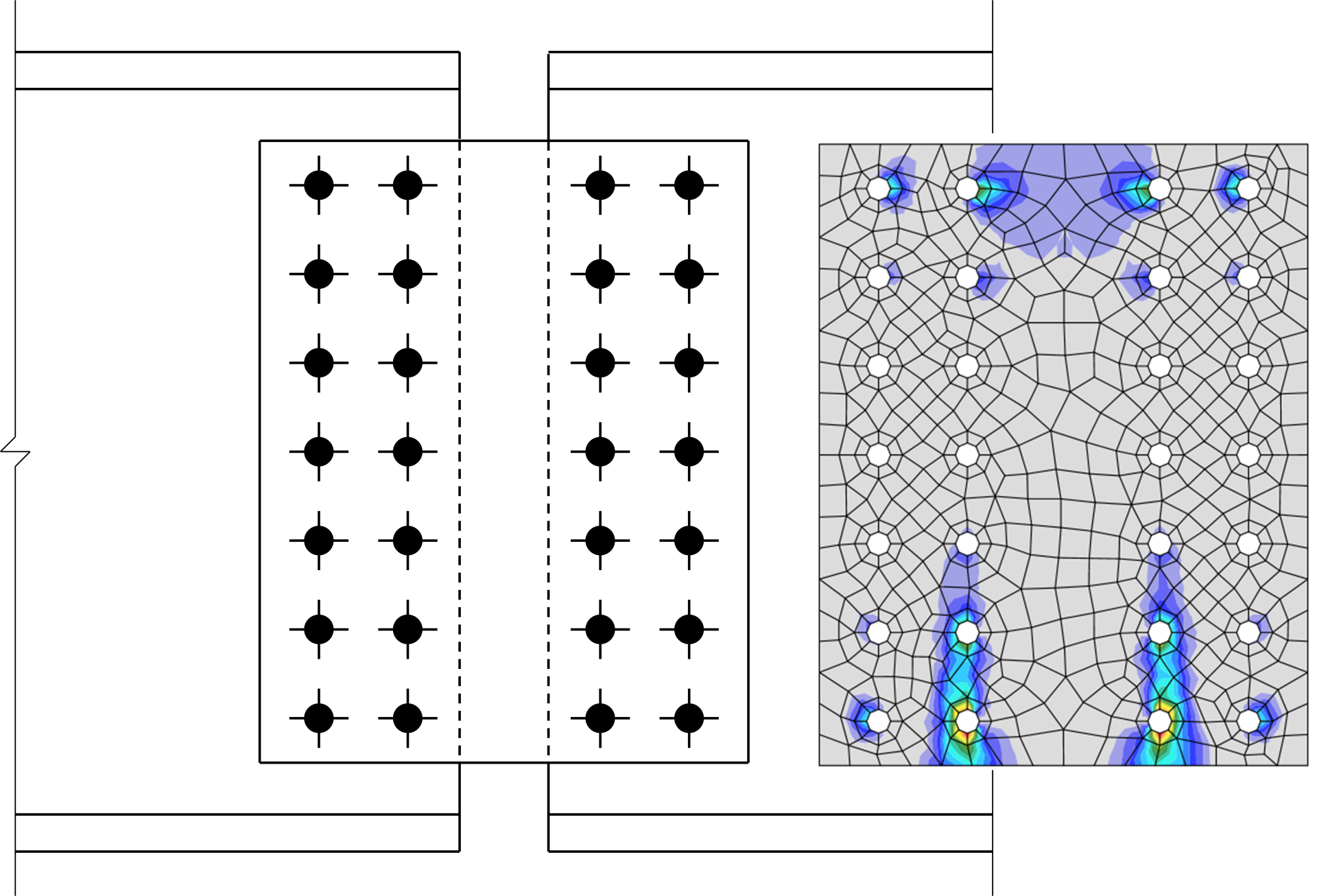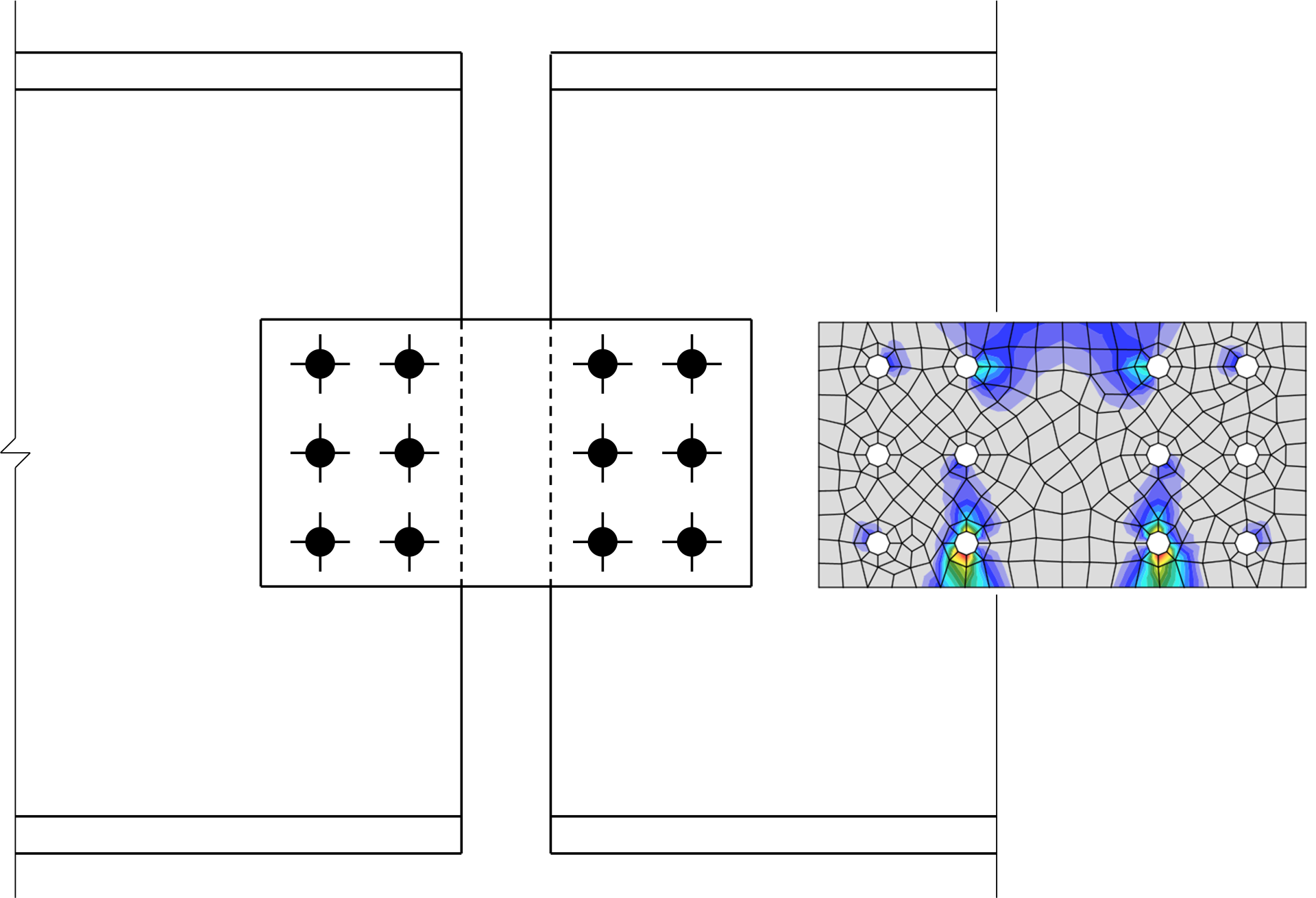 As an example of the combined result of the differences between the AISC Specification equations and IDEA StatiCa, consider the two beam splice connections shown in the figures below. For both, two W27×94 beams made of A992 steel are connected by splice plates on either side of the web. The splice plates are 3/8 in. thick and made of A36 steel.
