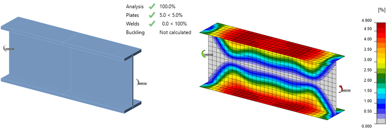 Engineers must also perform a linear buckling analysis to detect buckling. A linear buckling analysis can determine the elastic buckling load, expressed as a ratio of the applied load. While providing useful information that can guide design, the linear buckling analysis does not consider potential yielding that can reduce stiffness and the buckling load (i.e., inelastic buckling), nor does it consider the effects of initial geometric imperfections. Because of these limitations, to use IDEA StatiCa, the connection needs to be stocky enough that neither elastic buckling nor inelastic buckling will occur. The elastic buckling load ratio provides a convenient measure of stockiness (or slenderness).