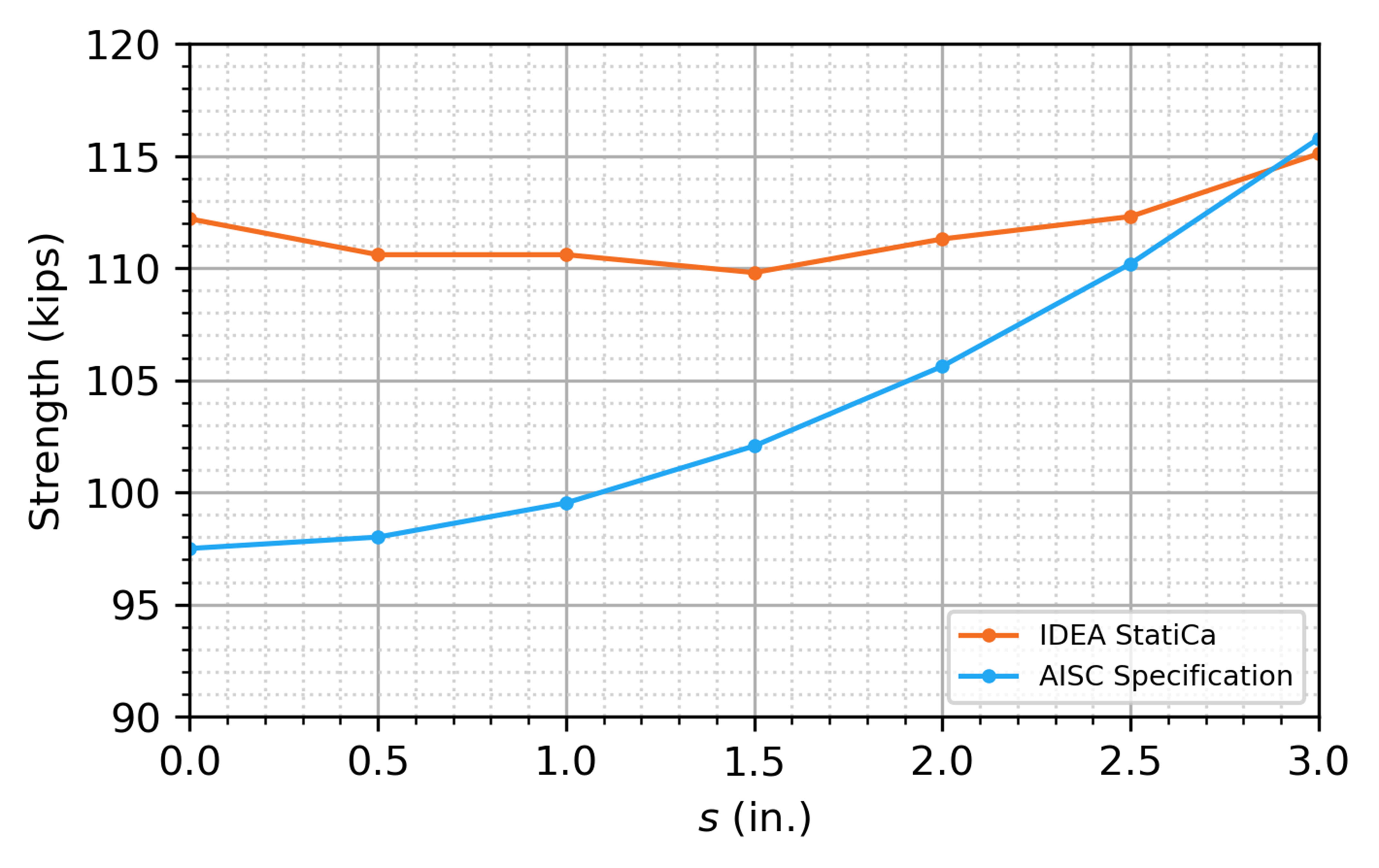 Analyses were performed for connections with dimension s varying from zero (i.e., no stagger) to 3 in. in increments of 0.5 in. The strength per the AISC Specification was calculated using the provisions of Section B4.3b. The limit state of tensile rupture along the zigzag line shown as a red dashed line in the figure above controlled for all cases. The strength per IDEA StatiCa was determined iteratively using stress-strain analysis by adjusting the applied load input to a value that the program deems safe but if increased by a small amount (0.1 kip) the program would deem unsafe. The 5% plastic strain limit controlled for all cases. The results of the analyses are shown in the figure below.