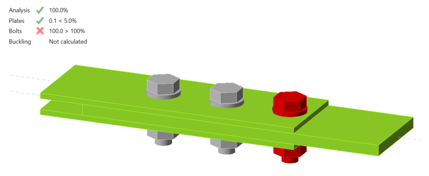IDEA StatiCa evaluates the strength of each bolt individually, with required strengths determined from the nonlinear analysis and available strengths calculated using the provisions of the AISC Specification. This evaluation complies with the user note in AISC Specification Section J3.7. However, IDEA StatiCa does not simply sum up the effective strengths of the individual fasteners. The approach taken by IDEA StatiCa can result in a conservative underestimation of strength.