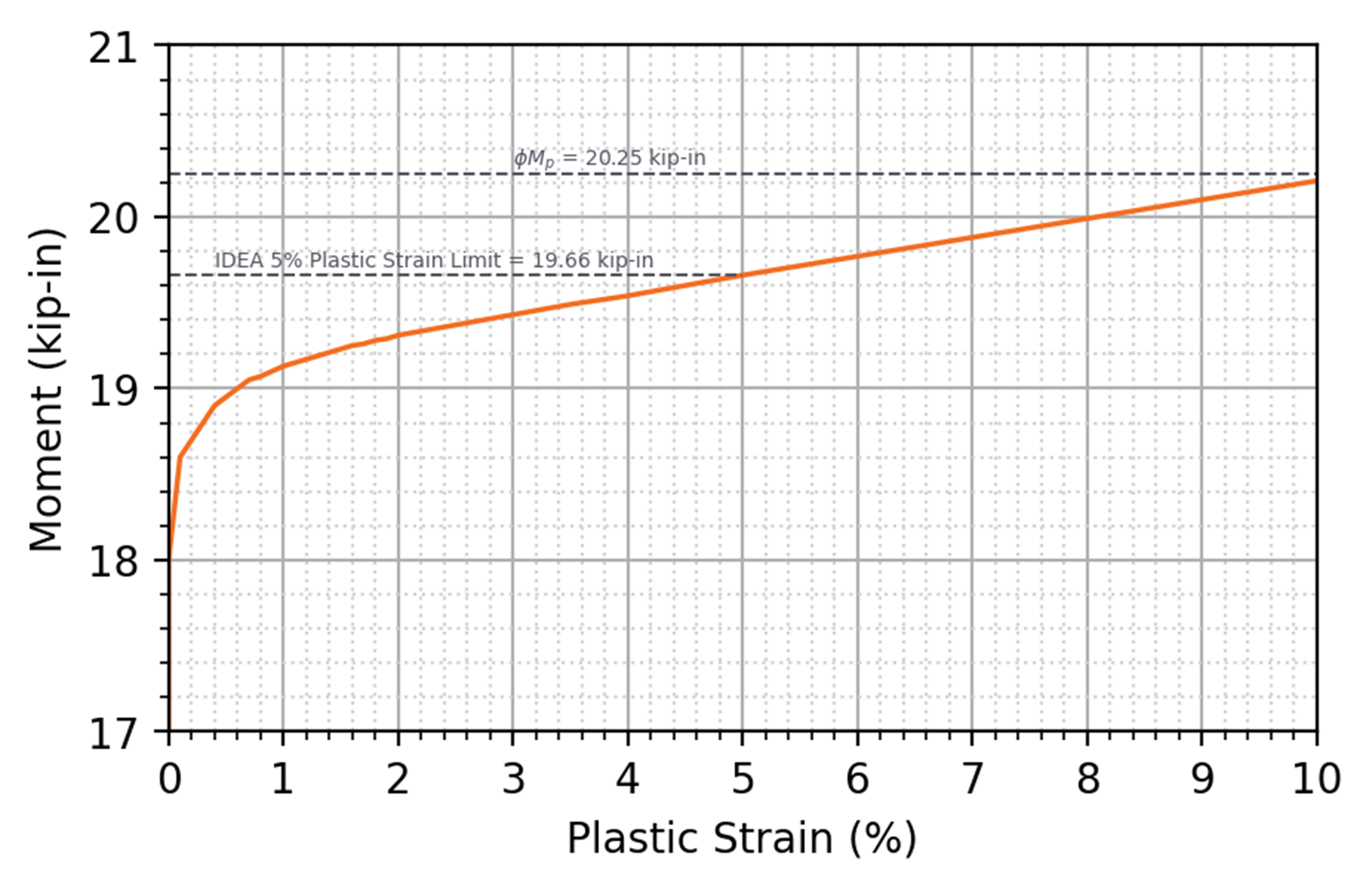 The commentary on Chapter K states “When inelastic finite element analysis is used, peak strains in the thick shell (T × T × T) elements should not exceed 0.02/T at the nominal capacity, where T is the thickness in inches.” Neglecting the difference between strain and plastic strain, the limiting value of this recommendation is greater than the 5% used by IDEA StatiCa when the thickness is less than 0.4 in. While the strain limit in the commentary recommendation is more restrictive than the default limit in IDEA StatiCa for thicker tubes, the 5% plastic strain limit is more widely recognized as an acceptable limit for strength design including by the Steel Tube Institute.