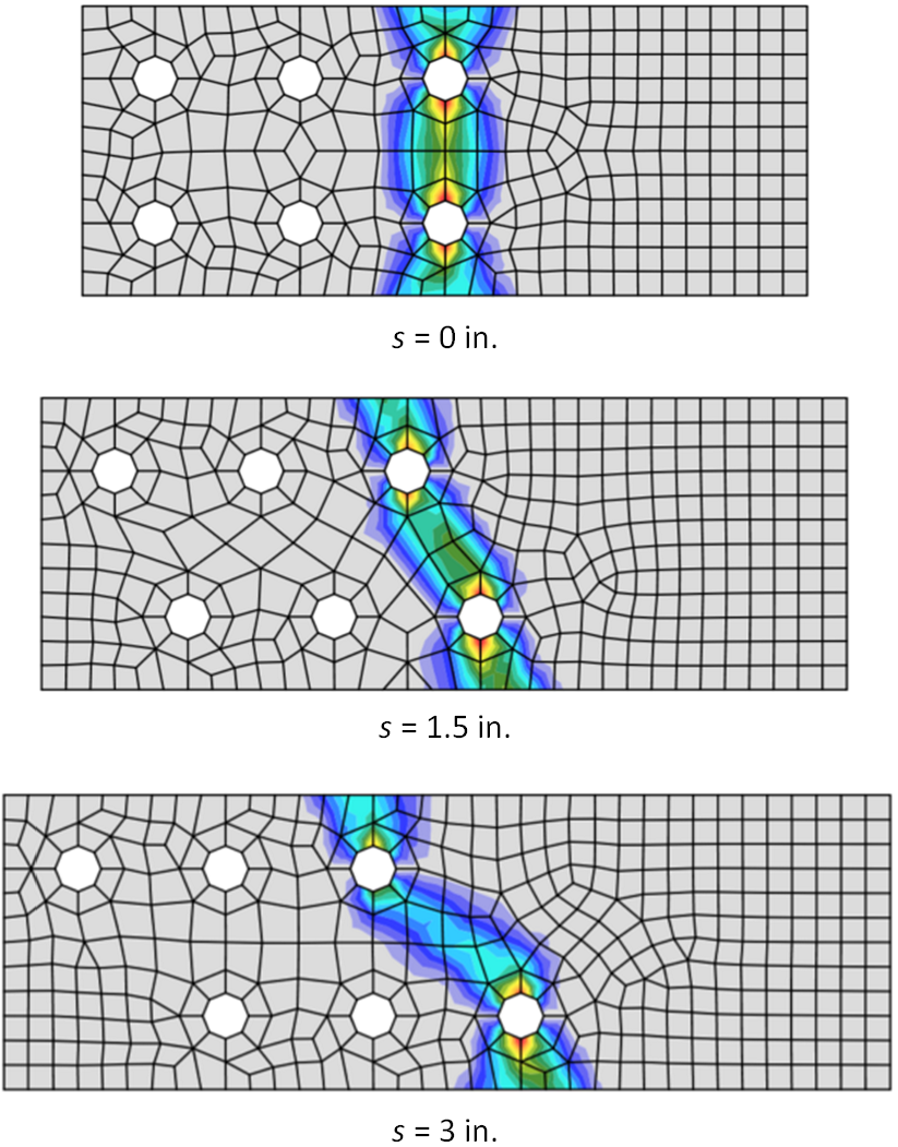 The AISC Specification results show a clear trend of increasing strength with dimension s. The IDEA StatiCa results show less sensitivity to the dimension s and the strength is greater than that from the AISC Specification for all but the s = 3 in. case. However, the expected zigzag failure pattern is captured by the model as demonstrated in the figure below which shows the plastic strain in the test plate at the maximum permitted applied load.