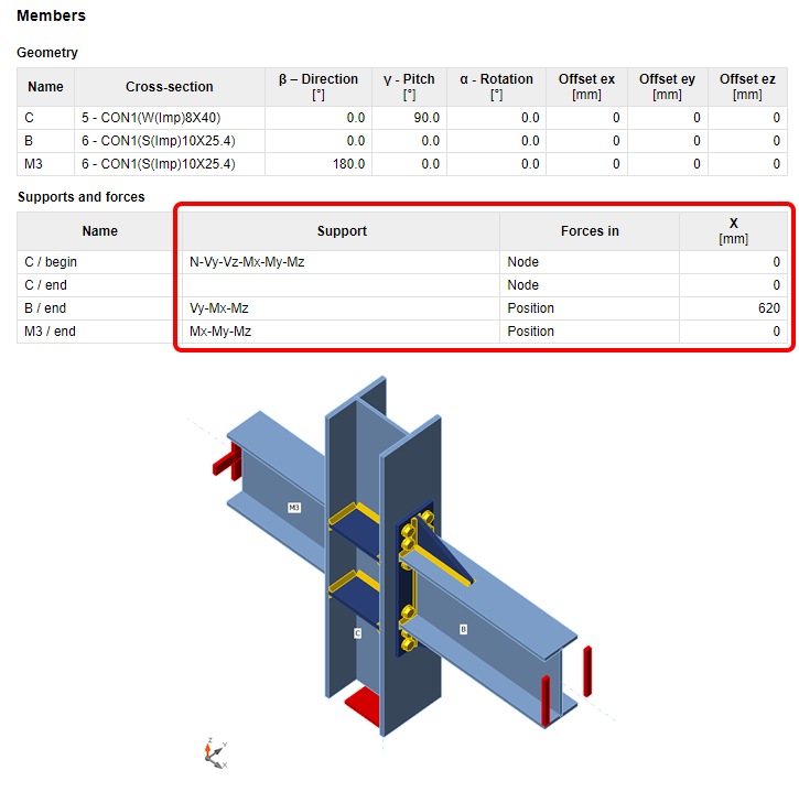 The chosen model type (the applied supports, respectively) are presented in the table and in the figure below. For example, the supported end of the bearing member will have all six reactions listed, while the free end will have none of them. For the N-Vy-Vz model type, the complementary forces, i.e., Mx-My-Mz, will be presented. The calculation report also includes boundary conditions.