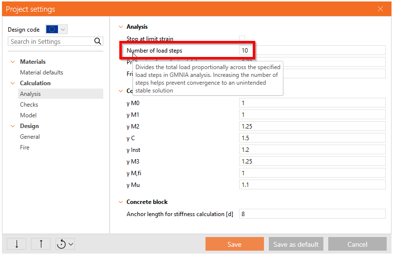 Le paramètre, Nombre d'étapes de charge pour l'analyse GMNIA, a été ajouté aux Paramètres du projet dans Membre afin d'améliorer la stabilité et la sécurité dans les calculs non linéaires des éléments. La charge totale est divisée en étapes incrémentielles (10 par défaut), ce qui réduit le risque que le solutionneur converge vers une branche stable imprévue de la courbe charge-déformation. Cette approche par étapes garantit une progression plus souple de la charge, un suivi plus précis de l'équilibre et une prédiction plus sûre de la résistance ultime dans les analyses non linéaires géométriques et matérielles.