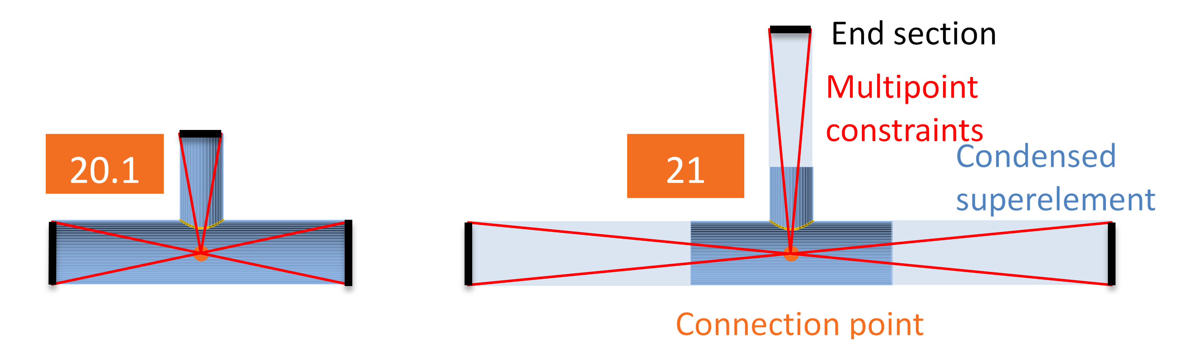 Cela est la raison principale pour laquelle ce changement a été effectué. La section transversale peut se déformer aux extrémités d'un modèle constitué d'éléments de coque. Les joints de sections creuses nécessitent des éléments relativement longs - jusqu'à 10 fois le diamètre de la section transversale. En introduisant le super-élément condensé derrière la partie du modèle constituée d'éléments de coque, le calcul est beaucoup plus rapide avec la même précision.