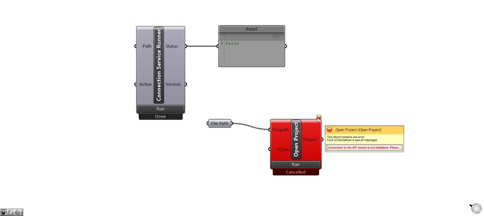 Comme pour les autres clients API, vous pouvez connecter le script Grasshopper à une instance API d'exécution (Connection Service Attacher) ou démarrer le service dans Grasshopper (Connection Service Runner). L'utilisateur doit sélectionner l'un des composants ci-dessus et l'exécuter avant qu'aucun des composants API ne puisse s'exécuter.