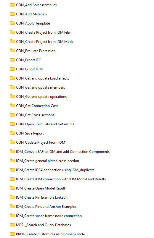 Une liste complète d'exemples est disponible pour les utilisateurs qui téléchargent le plug-in dans le fichier comprimé : %appdata%\McNeel\Rhinoceros\packages\8.0\IdeaStatiCaGrasshopper\[0.0.0]\Examples 0.2.0.zip