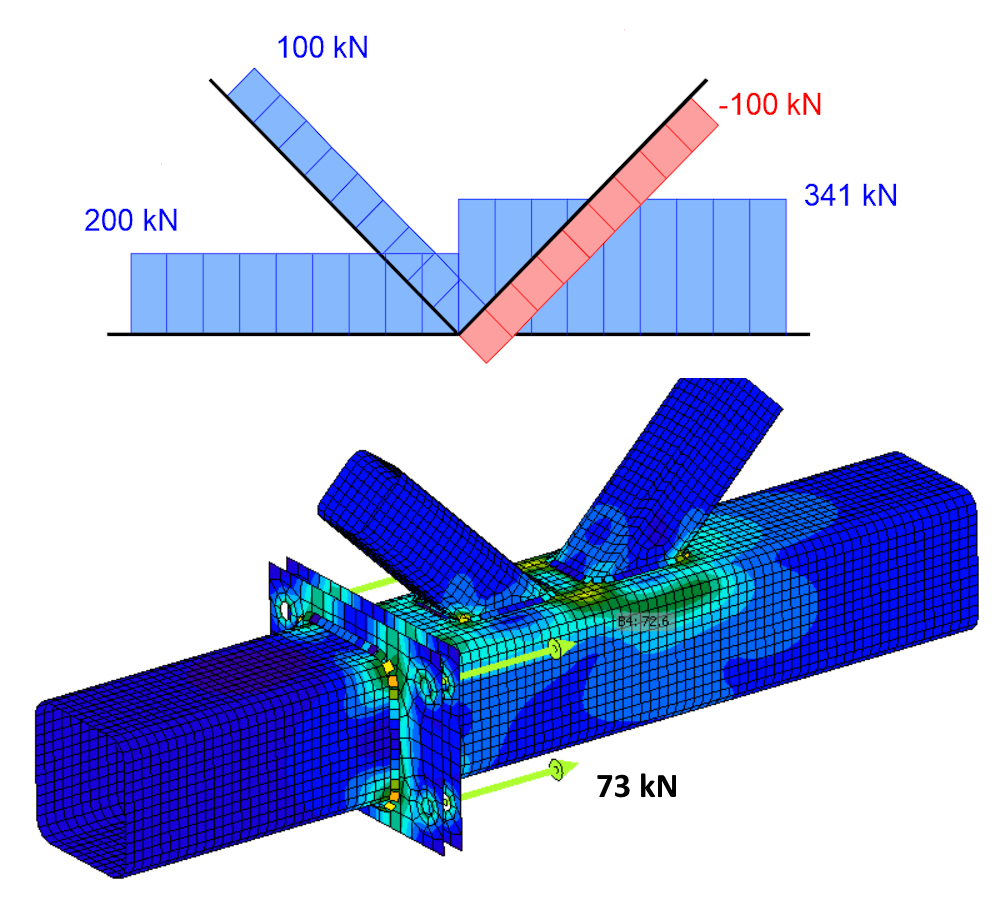 The image above shows a correct specification of balanced internal forces. The resulting normal forces in the truss elements (again using a simplified beam representation of the model) and the tensile forces in the bolts of the assembly joint are as follows. The tensile force in the bolt, including prying effects, is 73 kN.