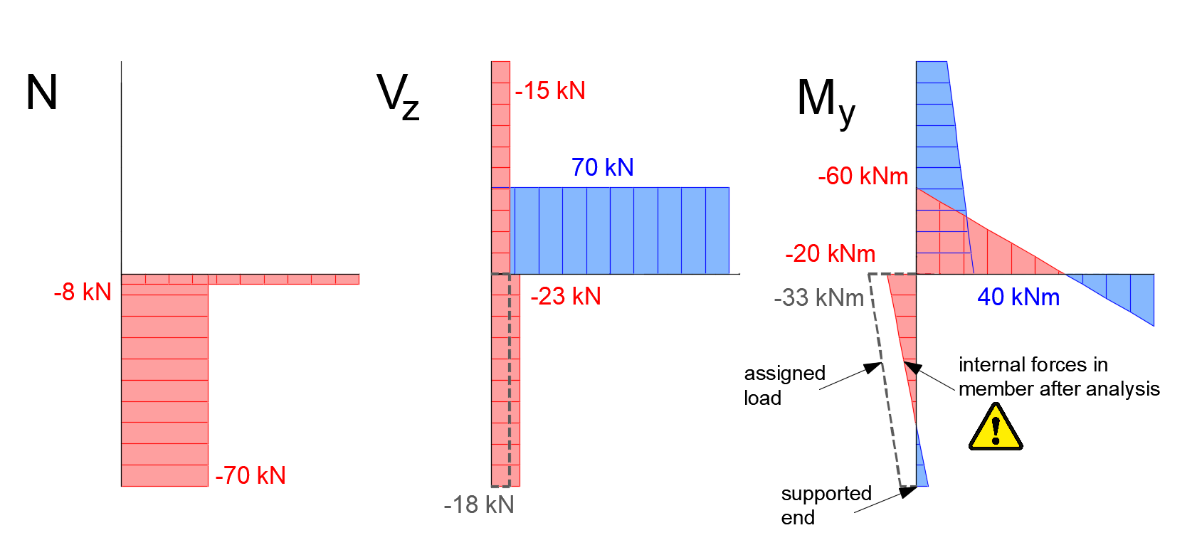 At the bottom of the column (B1/begin, the supported end of the bearing element), the diagram of the bending moment and shear force derived from the forces inputted into the load table are also visualized by a dashed line. It is evident that the bending moments really acting on the column differ significantly from what is specified at B1/begin in the table. These differences correspond precisely to the unbalanced forces of the moment My and shear force Vz. Why is that? As already explained, the internal forces specified at the supported side of the bearing member (B1/begin) are not actually applied to the model. Instead, internal forces result from the FEM model calculation as reactions in the supports of the calculation model. And, of course, these reactions are in balance with the load defined at B2 and B1/end. Thus, the effect of unbalanced forces in this example is that the supported bearing element is subjected to entirely different (lower) internal forces than those the user entered into the load table. For this reason, it is necessary to always try to have zero or minimum unbalanced forces in the connection.