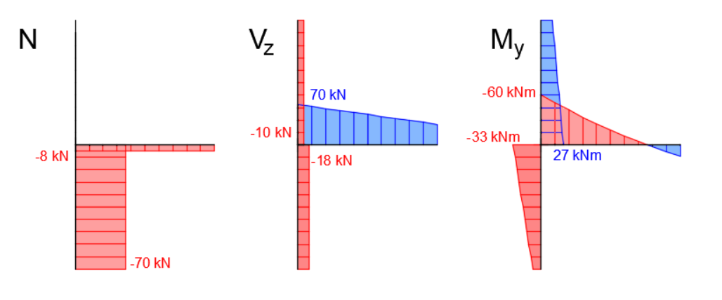 The internal forces diagrams in more detail around the connection, together with the numerical values directly at the connection node are: