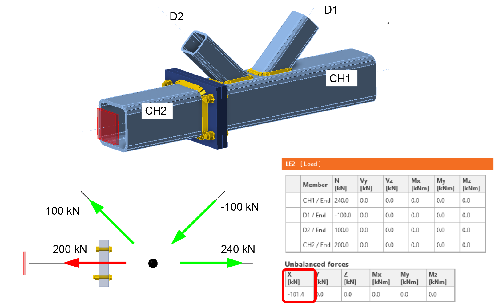 Now, we will analyze the same joint with unbalanced loading in the horizontal direction X. The loading on the joint is identical to the previous example, except for an incorrectly specified normal force of 240 kN on the bottom tension chord CH1, causing an unbalanced force in the X direction of 101.4 kN.