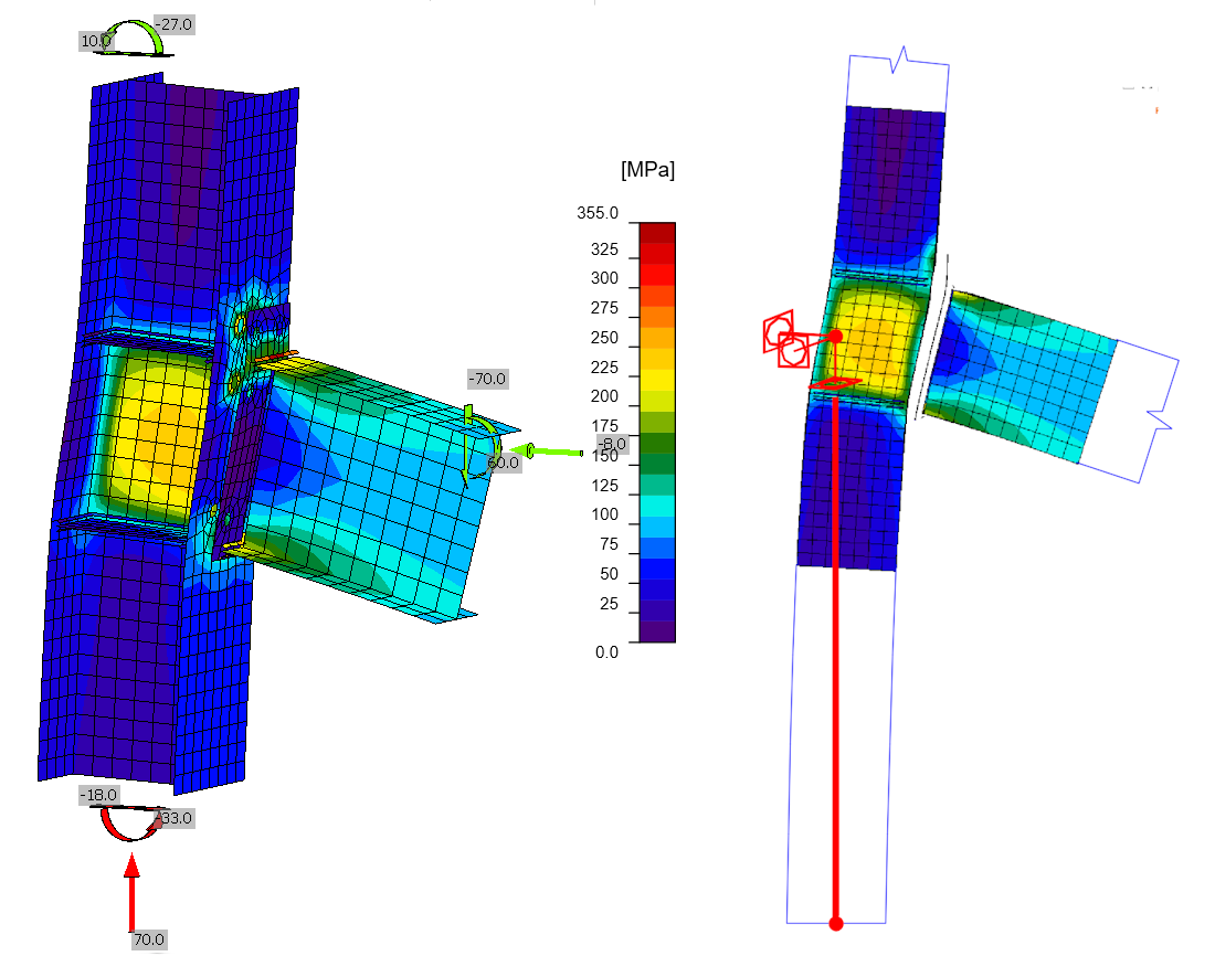 However, it is important that the internal force distributions in the connected and loaded element B2 are not influenced by the statically indeterminate boundary conditions of the model, and the assessment of the individual element B2 and its connection (end plate, bolts, welds) remains correct. However, the stress state of the column no longer corresponds to the actual behavior in the structure, especially since no loads were applied to it. This shows that disabling the Load in equilibrium function allows the separate assessment of individual members connections. In contrast, with the Load in equilibrium function enabled, the entire connection can be checked, considering the interaction of global effects (e.g., column stress from N+M in the structure) and local effects (e.g., transverse bending of the HEA flange from the bolted end plate connection).