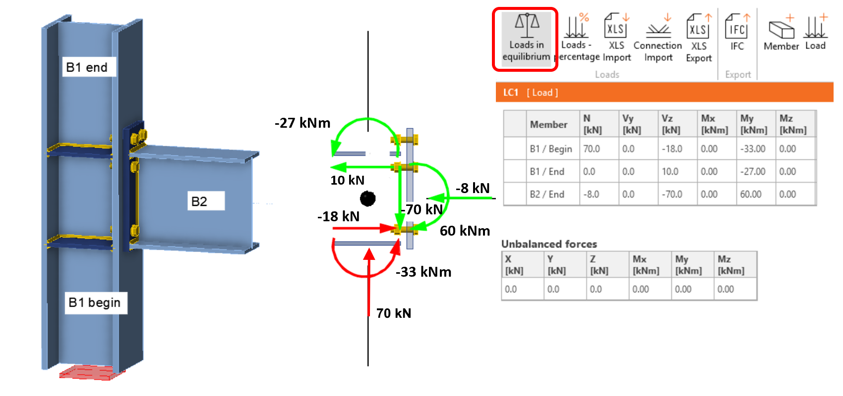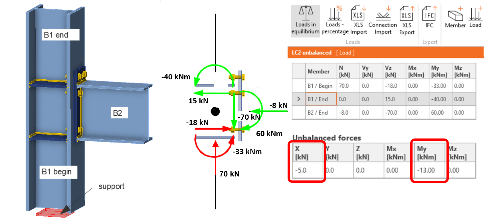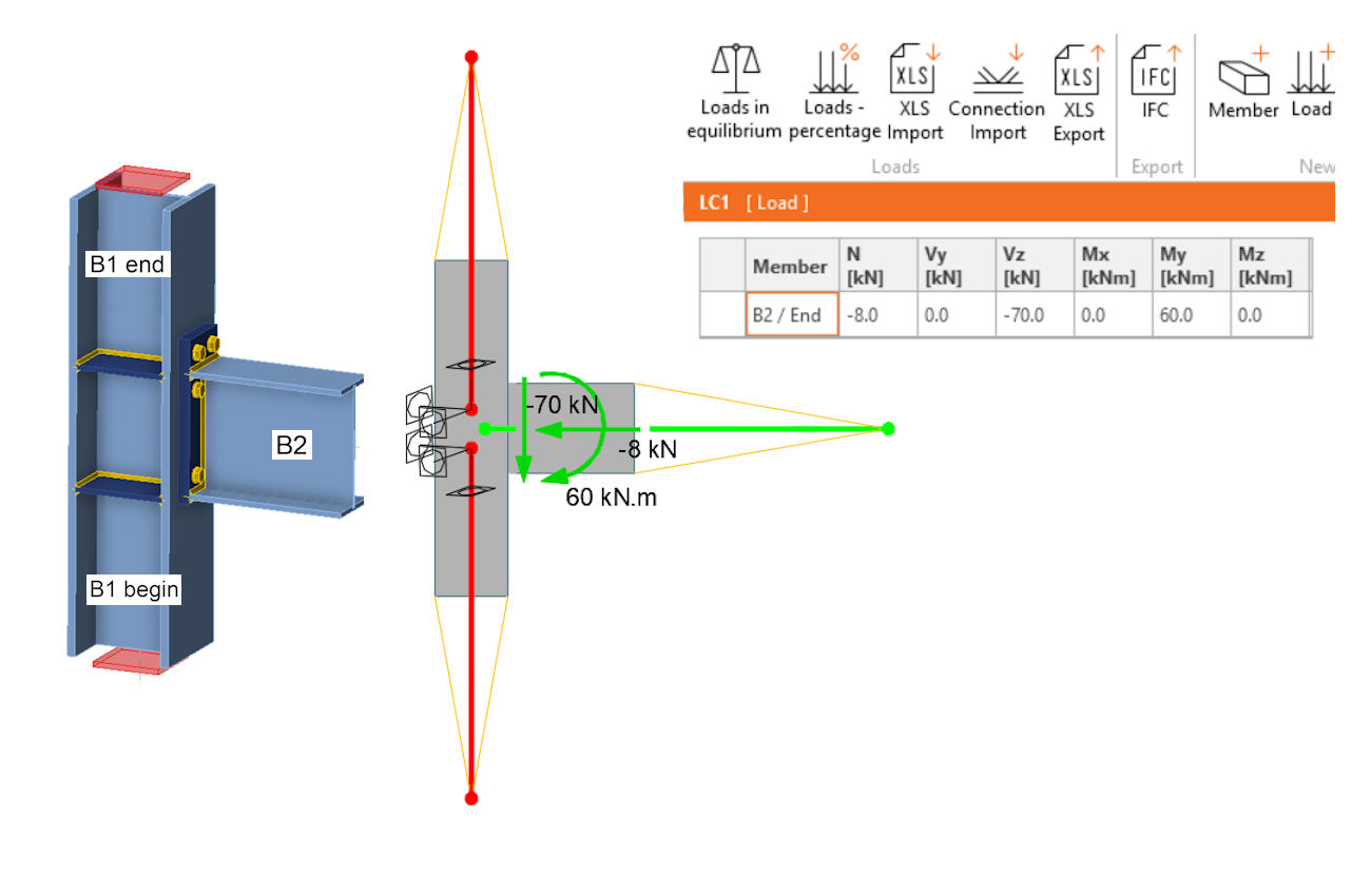 For completeness, it should be added that, in this particular case, the horizontal beam connection itself (bolts, end plate, welds) is evaluated correctly because exactly the same load specified for the B2 member in the load table is applied to this member also in the computational model.