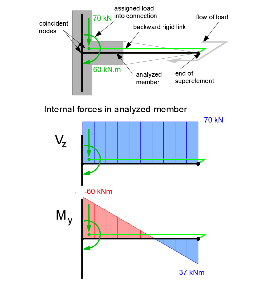 The model loading is applied (like model supports) to the starting nodes of the backward rigid links connecting the connection center and the end of the condensed superelement. In other words, the internal forces in individual members (at the connection center), which were defined in the loading table, are directly set into the computational model. The backward rigid links then ensure that the bending moment from the connection center is transformed to the bending moment at the end of the condensed superelement. Let's illustrate the function of the backward rigid link more clearly using a simple beam model, where the horizontal member B2 is represented by a simplified beam element instead of the shell 3D model. The internal forces on the member at the center are taken from the example: Vz = -70 kN, My = 60 kN.m. This force and moment are set at the beginning of the rigid link. From there, they are transferred to the end of the condensed superelement and then into the model of the connected element B2. As can be seen, the internal forces in member B2 at its beginning (connection center) are then identical to the inputted point loads.