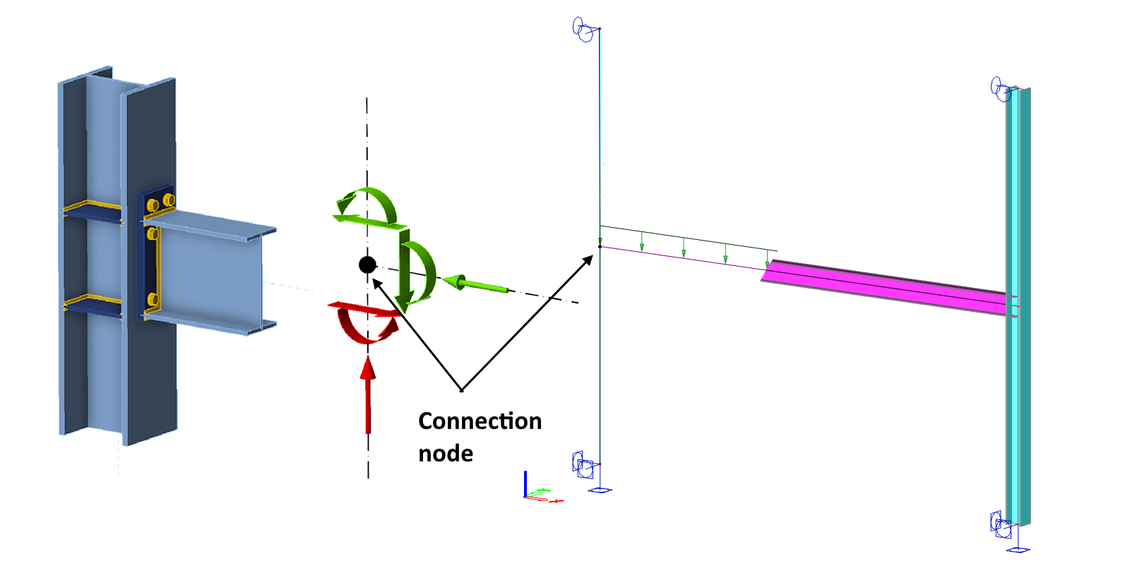 In Connection app, the 3D computational model of the connected member is loaded with internal forces acting in the individual members immediately at the connection node. The center of the connection, represented by a black point in the wireframe view of the connection in the application, is thus identical to the node in the global FEM beam model.