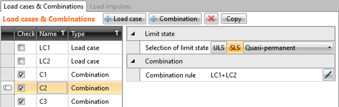 Serviceability limit state (SLS) checks are now implemented to allow a full code-check for standard and non-standard beam details, walls, frame joints, etc. The very first step into SLS in Detail application is in the definition of Loads. There are new switch buttons in the definition of combinations with a combo box for proper selection of SLS combination type. Partial factors are available in the same way as for ULS combinations under the pen icon.