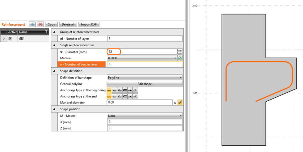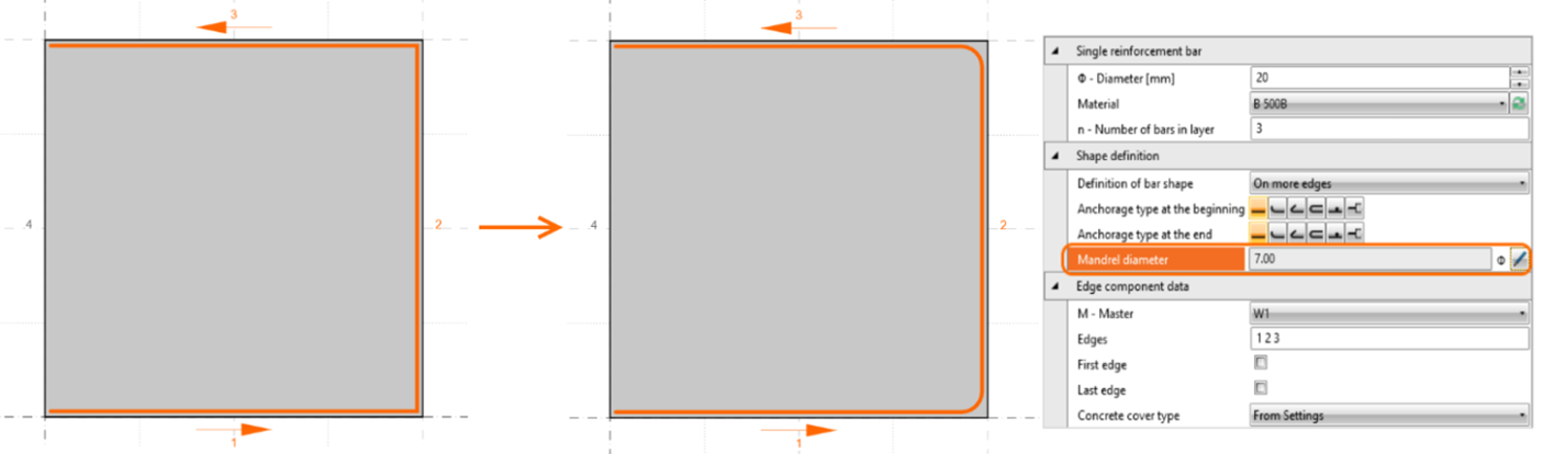 The definition of a group of bars as a polyline or on more edges now makes mandrels at the corners. The default setting is based on code provision (4 profiles diameter under or exactly 16 mm and 7 profiles for diameters above 16 mm) or can be set manually by pen icon.