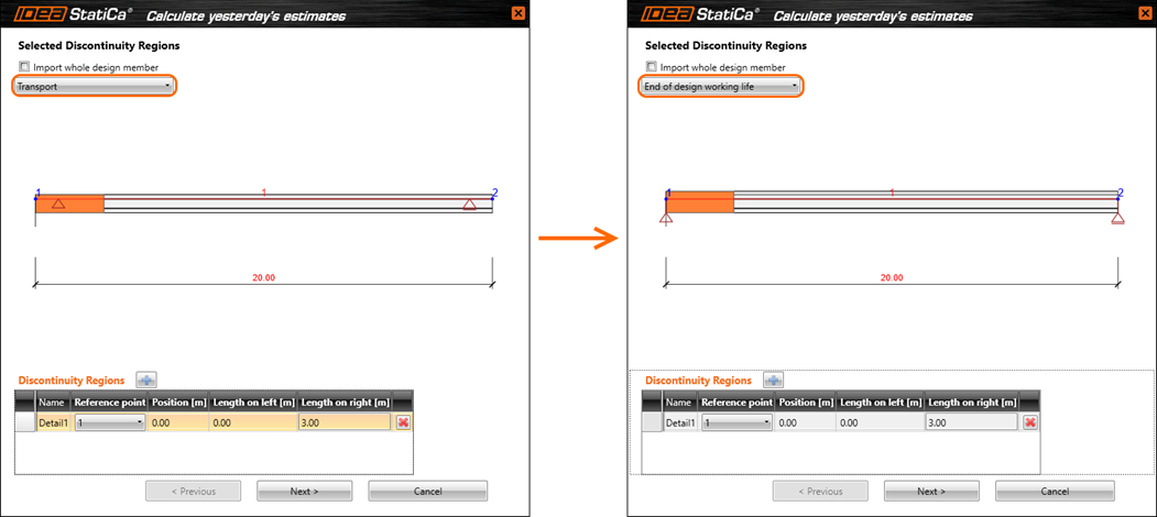 The wizard is now able to export the beams with respect to the construction stages. The wizard contains a new combo box for the selection of desired construction stages and selects corresponding combinations for export. The effects of prestressing are imported as point loads, but the tendons themselves are not to be found in the model. They will be represented by the effects of internal forces.