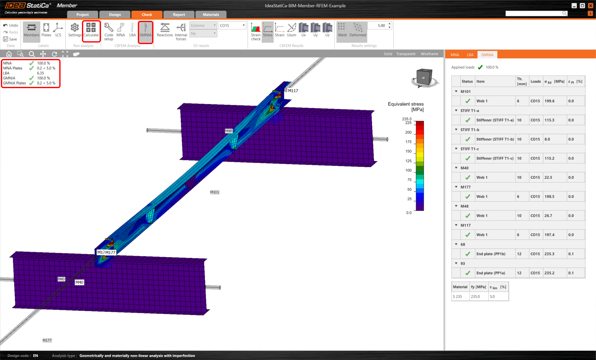 The second analysis is LBA (lateral buckling analysis), where we get a critical factor of less than 15. This result shows the necessity of running the GMNIA (geometrically and materially non-linear analysis).