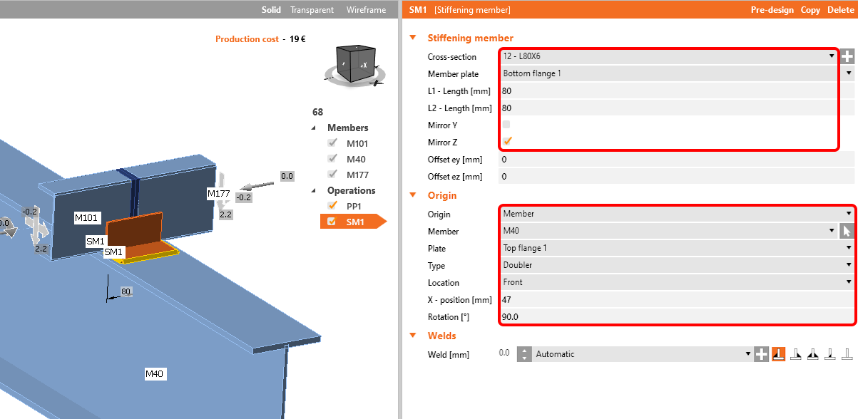 The next operation is the Stiffening member, set L-profile L80x6 with the following values.