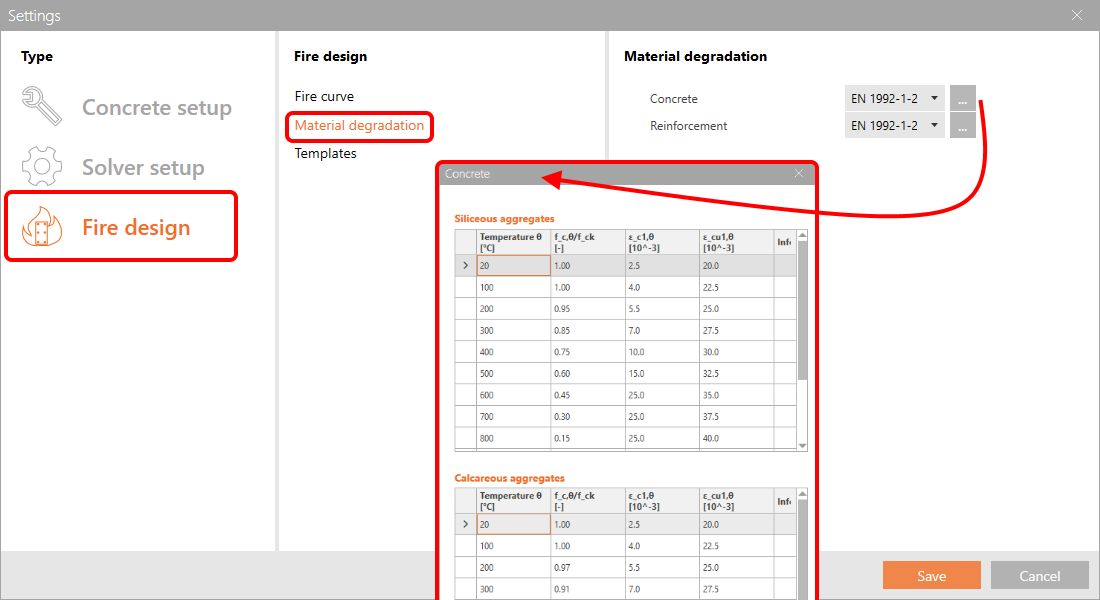 The output of the thermal analysis is a temperature field within the cross-section at the time indicated by the fire resistance class (R 60, e.g.). Such a distribution of the temperature within the cross-section is used to determine the material properties of concrete and reinforcement and thermal strain. The material degradation respects tables stated in the Eurocode EN 1992-1-2 or can be defined by the user and saved in the templates.