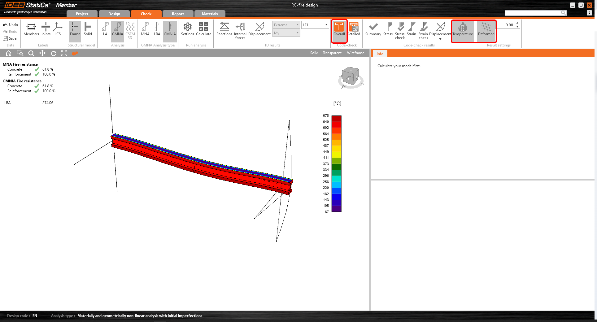 After performing the thermal analysis (TA), geometrically and materially non-linear analysis (GMNA) is automatically started using the outputs of thermal analysis as the initial state of the analyzed member. The results of the GMNA are stresses and strains which are compared to the limit (degraded) values.