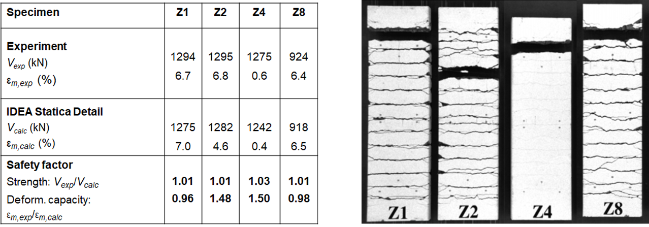 The results of these tests were compared to a wide range of analytical solutions, design codes, and experimental results, and show good compliance with all of them. The results for the ultimate load (strength) correspond very well and are slightly on the safe side. The results for deformation are also nice and the error is mainly on the safe side.
