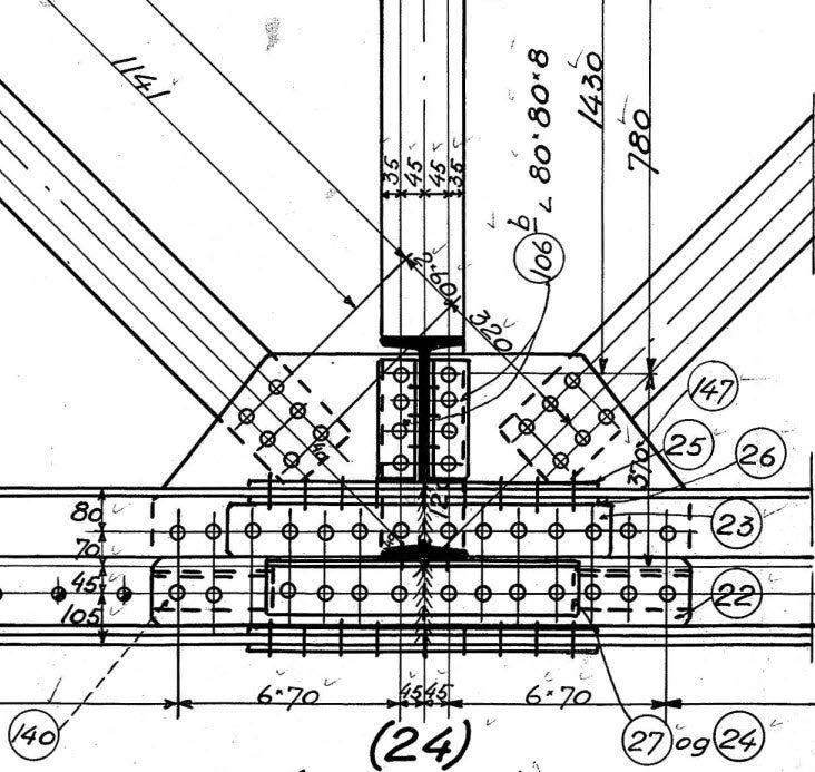 The connection in the next figure is the splice of the bottom chord, which also connects the middle vertical bar to the top chord. This was a rather complex joint and it was not so easy to decipher how the joint was constructed based on the original drawings (see the drawing below the connection). Using IDEA StatiCa as a visualization tool was therefore very helpful in making sure they had the correct interpretation of the drawings.
