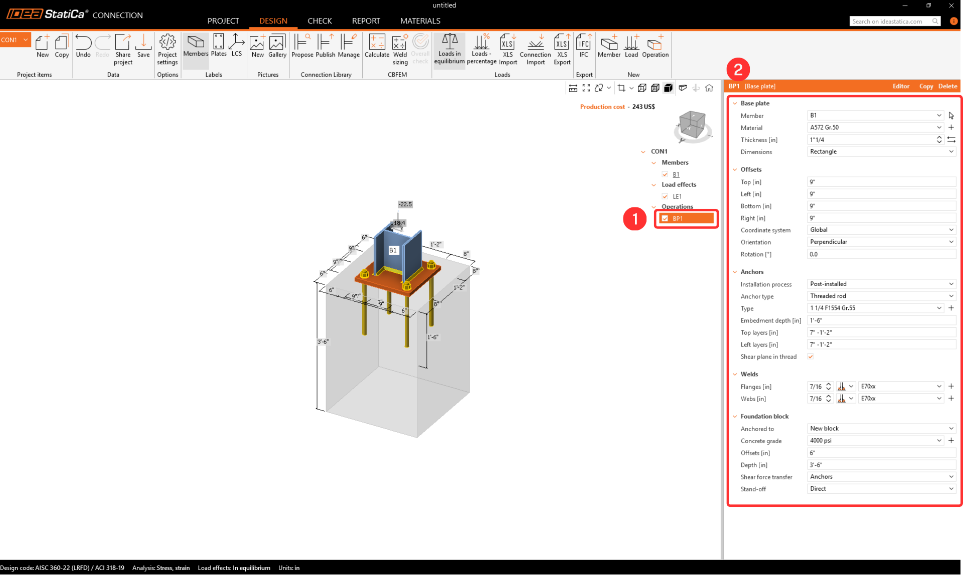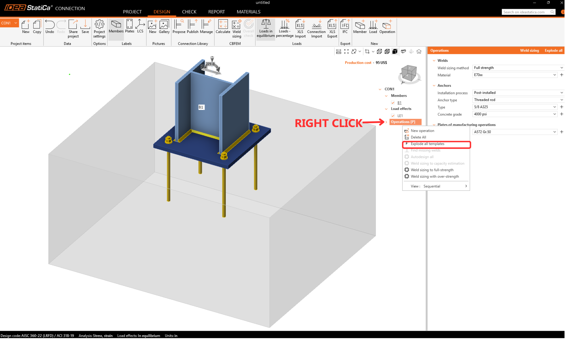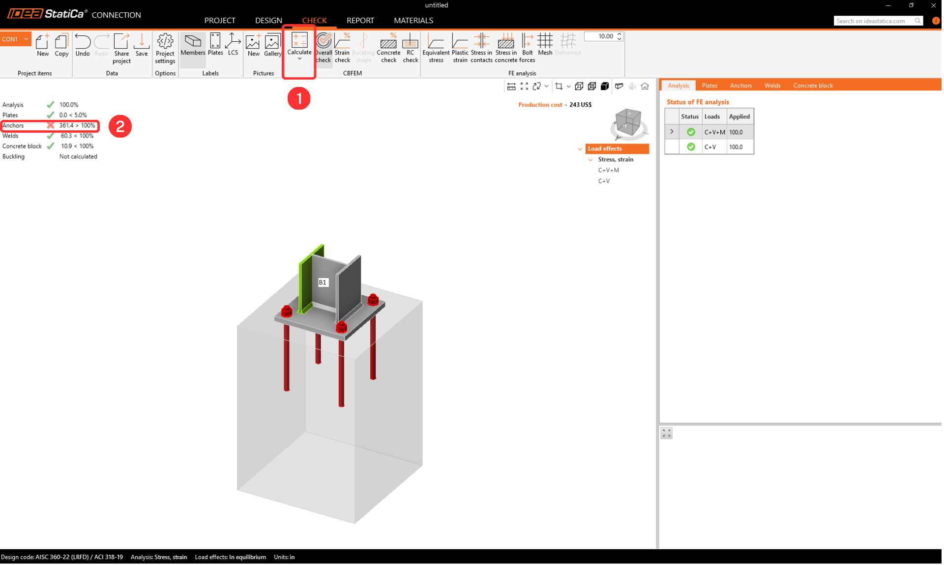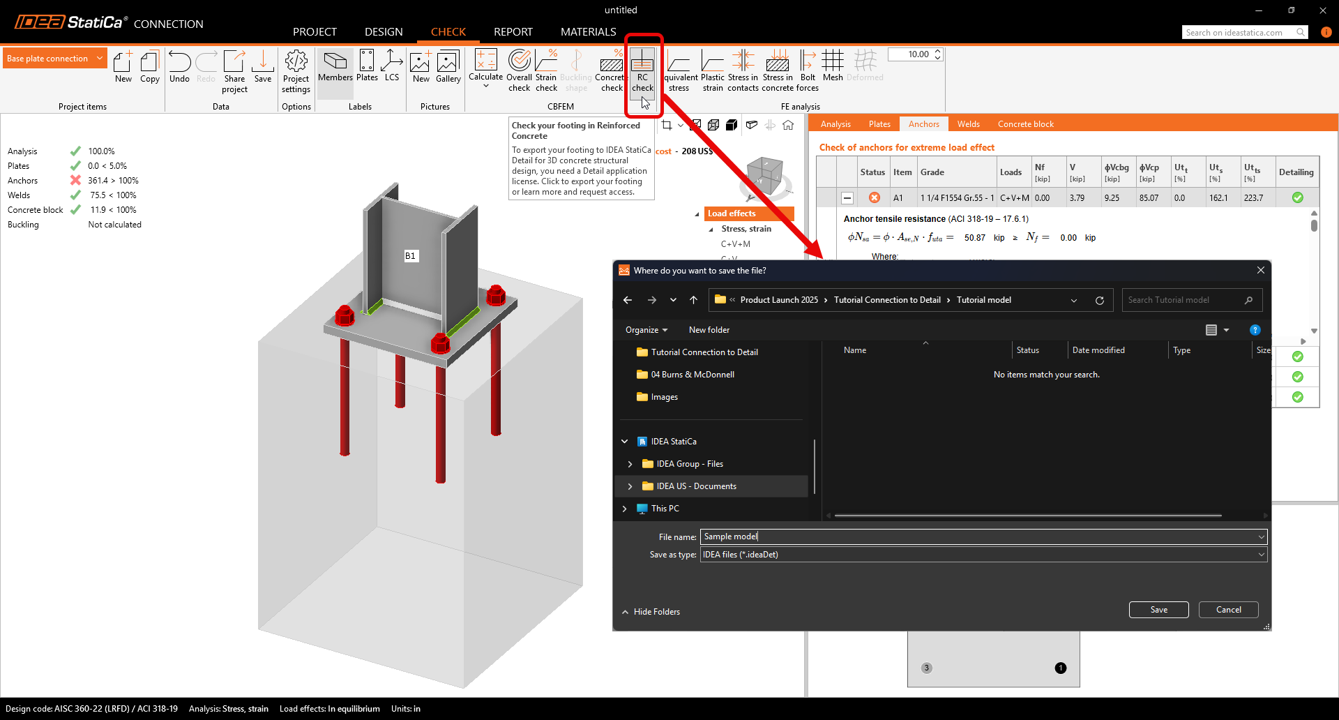 You have checked the whole connection design according to AISC and ACI 318. The steel part was checked in IDEA StatiCa Connection, and the concrete block was code-checked in IDEA StatiCa Connection and Detail.