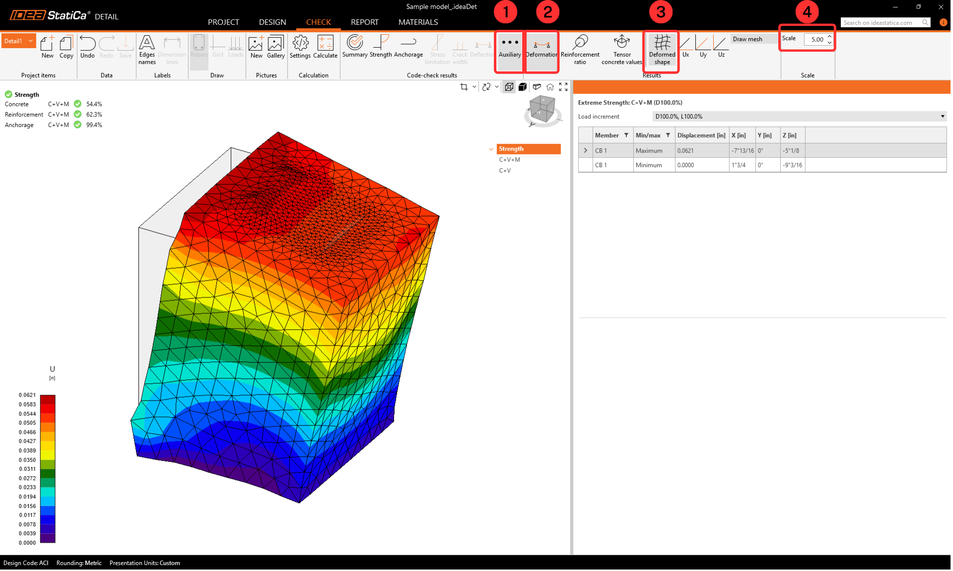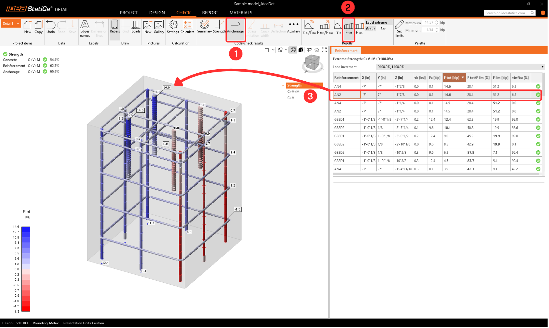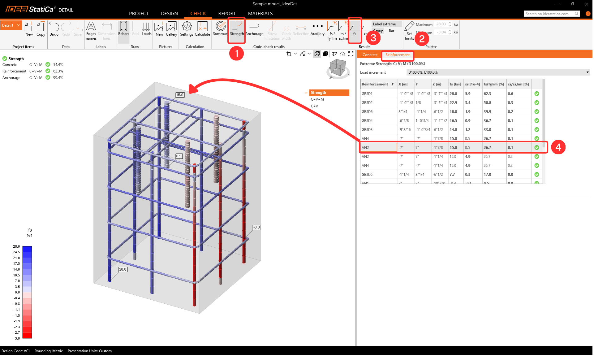 When displaying the utilization of reinforcement, the user can clearly see which reinforcement contributes to transferring the load and preventing the concrete cone failure.