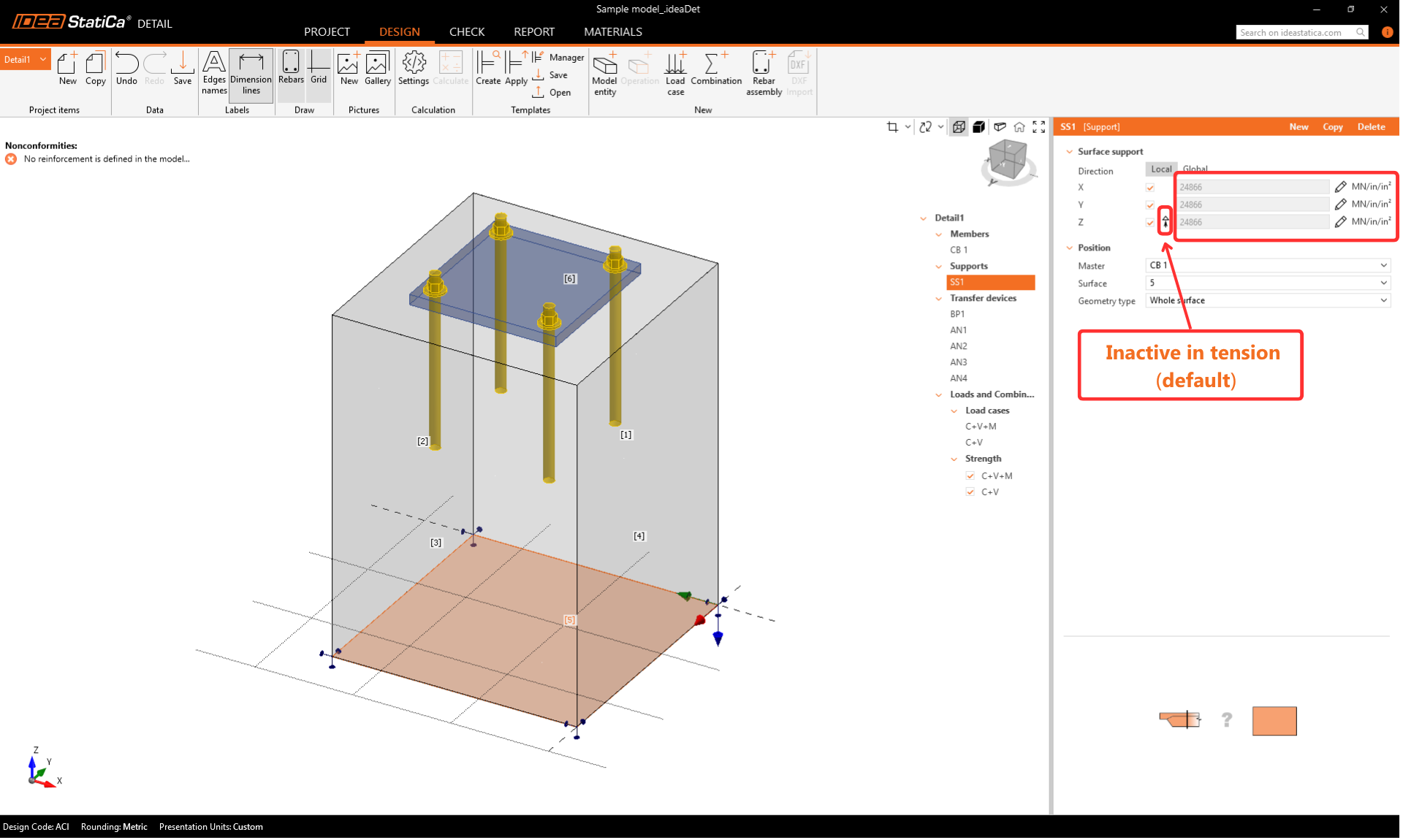 The ground has some stiffness, which should be considered for precise design. The Surface Support enables stiffness in all three directions and is set as the default inactive in tension (boundary nonlinearity).
