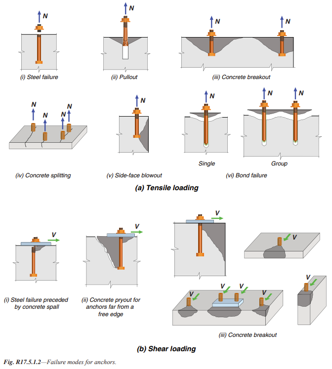 Let's explore the potential failures for tension, shear according to ACI 318 Section 17.4