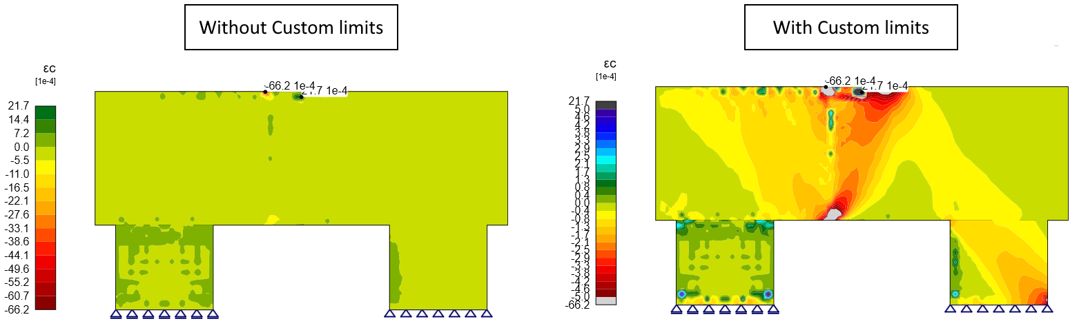 In the main ribbon, it is also possible to set custom limits for the color palette used to display results. This is particularly useful in cases where peaks with concentrated stresses occur, which would otherwise make it difficult to read the results and see the stresses in the rest of the structure.