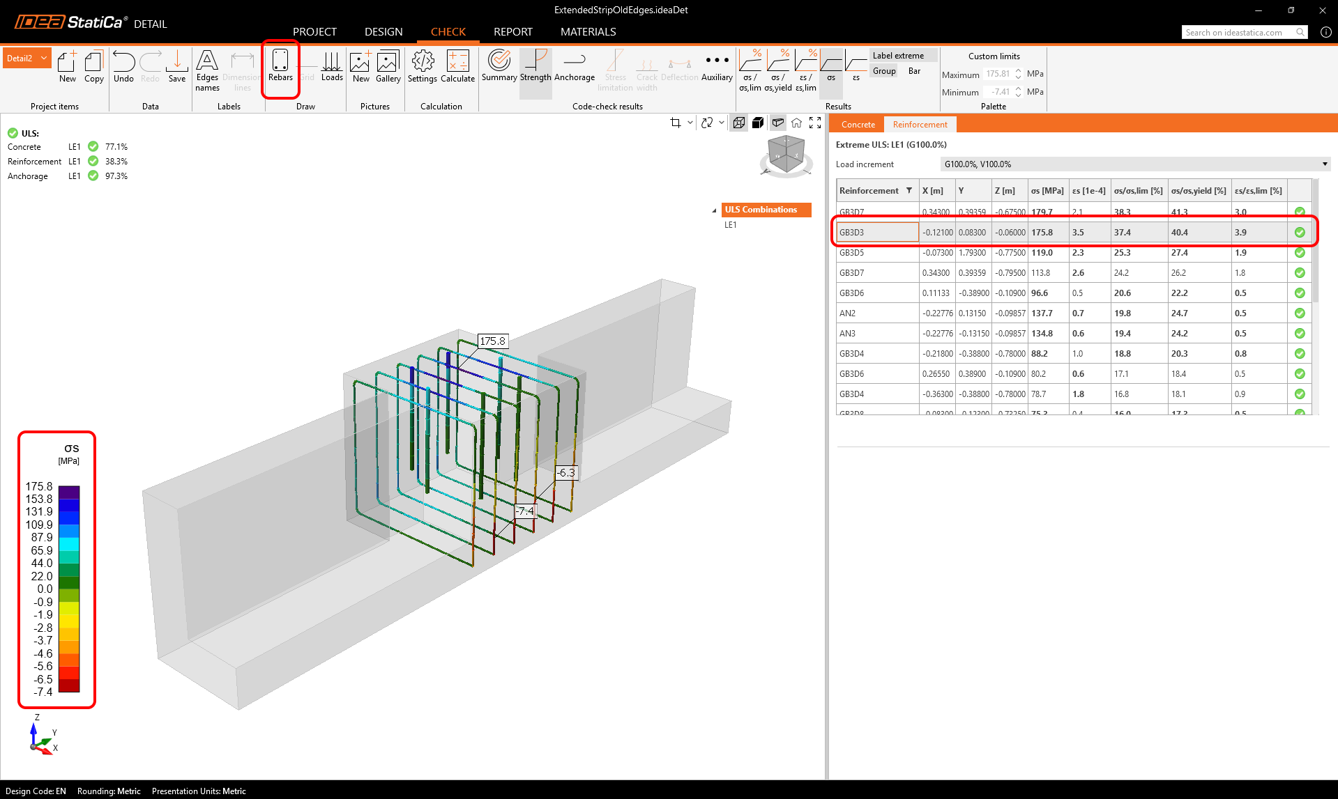 For Strength results on reinforcement (e.g., stress, strain) and Anchorage results (e.g., bond stress, Ftot, Flim) there is option to display only selected reinforcement.