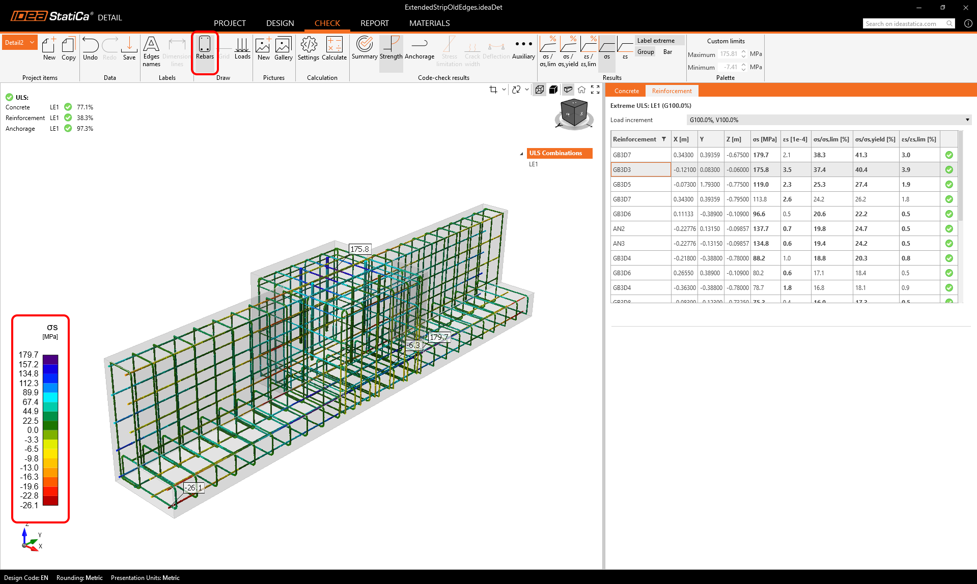 For displaying reinforcement results, it is possible to choose between so-called rainbow coloring or red-and-blue coloring (which distinguishes between tension and compression).