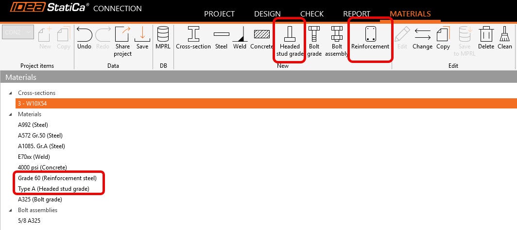 In the Materials tab, the Headed studs grade and Reinforcement material are placed in the top ribbon as well as in the left tree when used in the model.