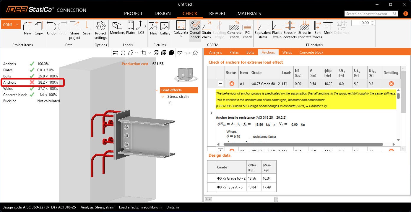 The checks are evaluated in line with CEB-FIP Bulletin 58, marking anchors as failed, even below 100% utilization. The other steel component checks remain available (except anchoring). And for advanced analysis of the concrete block with reinforcement, the model can be exported to IDEA StatiCa Detail.