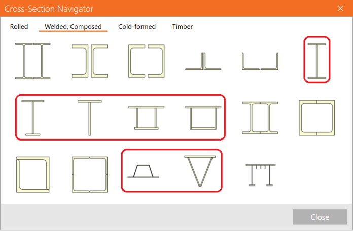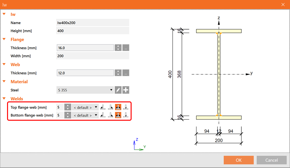 The option to change the weld type to such weld profiles to perform crane girder welds and crane runway beam welds is available for welded cross-sections in the library: